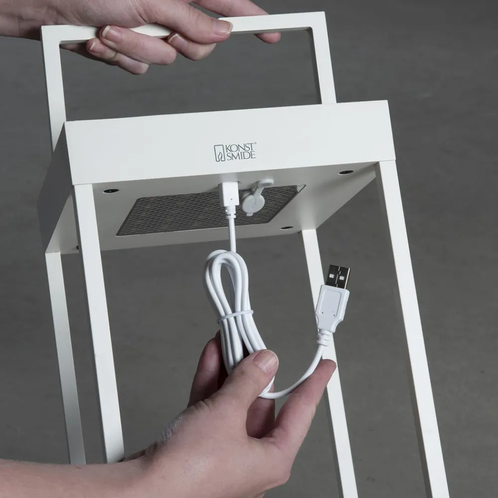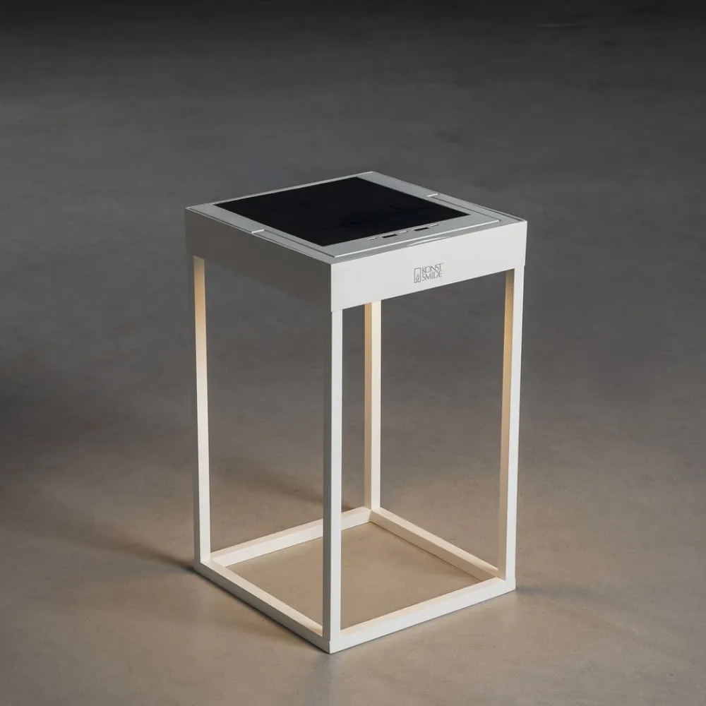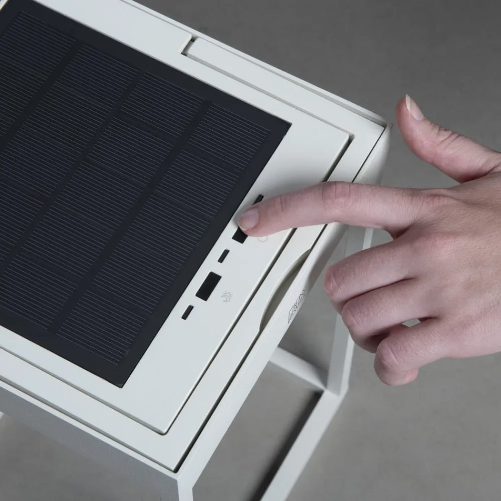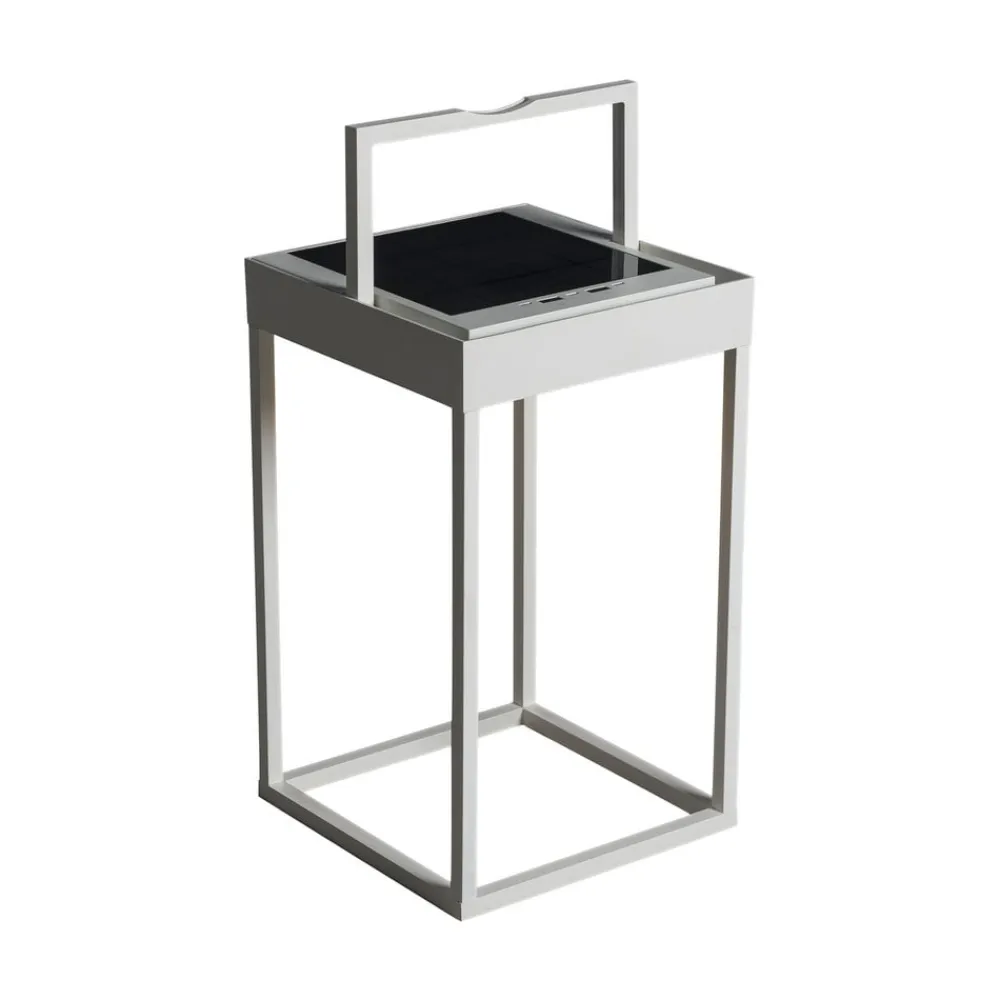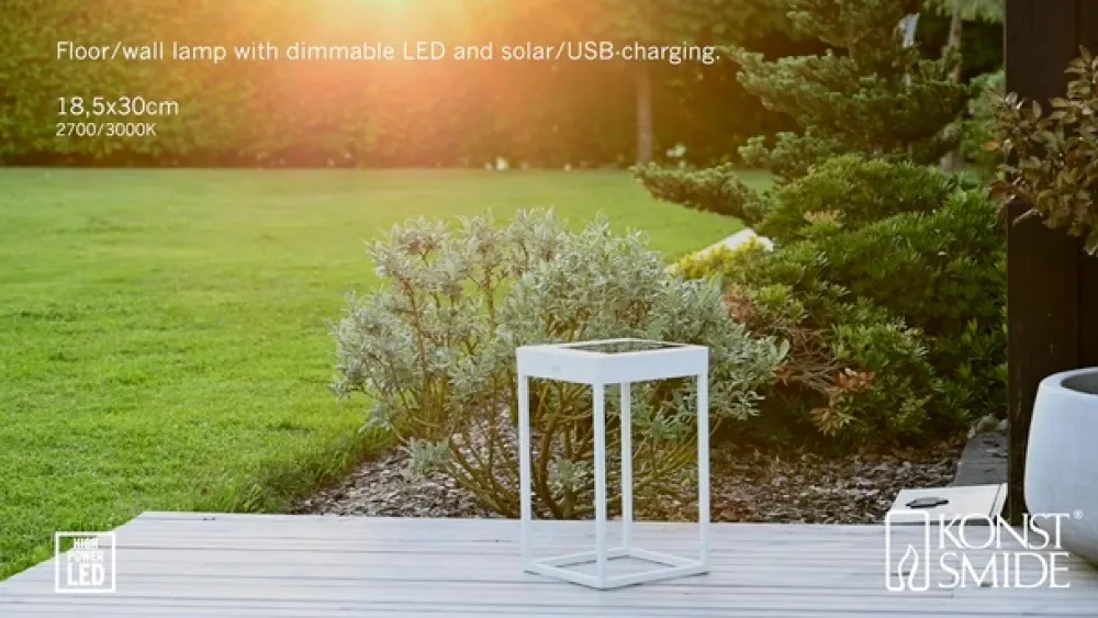 Portofino udendørs LED-lanterne til væg eller bord – genopladelig via USB-kabel eller solpanel Den dekorative Portofino udendørs LED-lanterne tilbyder alsidighed i enhver henseende. Takket være sit design som en moderne lanterne i en åben, ensfarvet kubisk form, passer Portofino ubesværet ind i enhver atmosfære. Det integrerede genopladelige batteri muliggør drift uden ekstern strømkilde. Den oplader sig selv via det integrerede solpanel på toppen. Hvis der ikke er tilstrækkeligt lys i omgivelserne, kan opladningen alternativt ske via det medfølgende USB-kabel. Lysstyrken på lysdioderne, som er integreret under toppen og lyser nedad, kan dæmpes fra 100 til 5 % efter behov ved hjælp af berøringskontakten på lampen. Farvetemperaturen kan også ændres mellem 2.700 og 3.000 K. Armaturet giver også stor fleksibilitet med hensyn til, hvor det kan bruges. Det kan placeres overalt i stuen, på terrassen, camping- eller havebordet eller monteres på væggen ved hjælp af det medfølgende beslag – inkl. USB-ladekabel – opladningstid: ca. 2,5 timer via kabel, ca. 20 timer via solpanel (afhængigt af omgivende lys) – brændetid pr. opladning: 9 timer ved 100 %, 20 timer ved 50 % lysudbytte – med skumringssensor til automatisk skift baseret på omgivende lysstyrke
