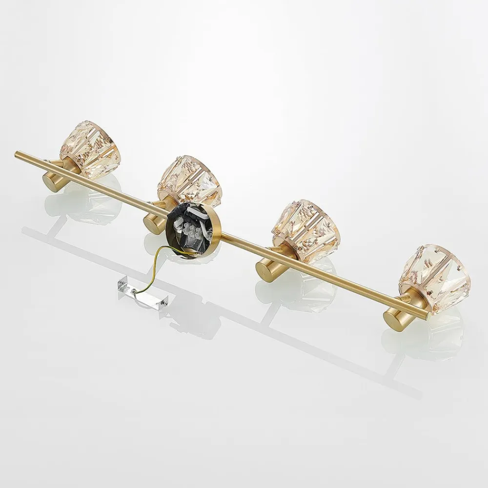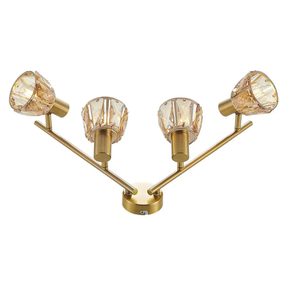 Kosta imponerer med en klassisk og samtidigt elegant virkning, for både skærmene og stellet har en varm udstråling. Metallet har en messingfarvet finish, og de fire skærme har ligeledes en metalramme samt indsatser af poleret, ravfarvet glas. Der skaber flotte lysrefleksioner, der virker som en smuk glitren. Hver skærm kan desuden drejes og roteres, så man bedre kan tilpasse lysforholdene i rummet.