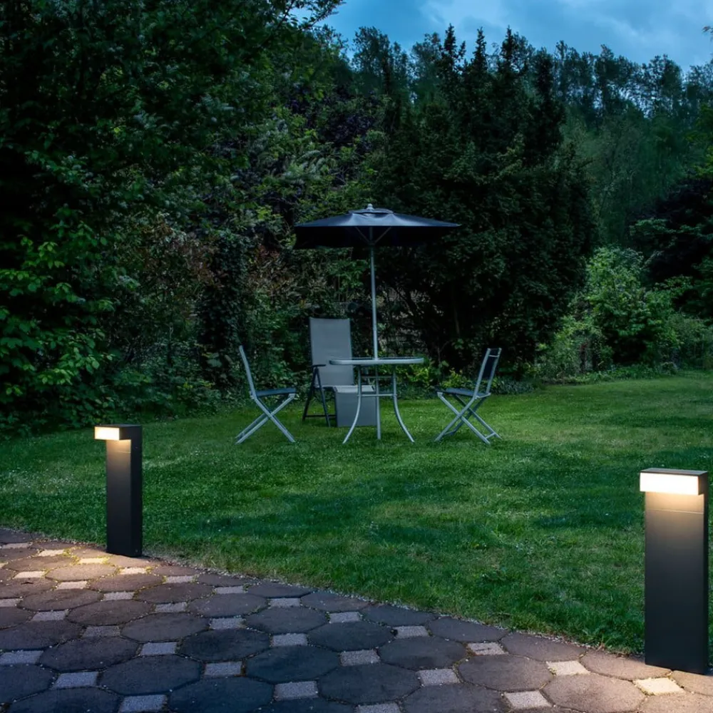 Designet i en høj, omvendt L-form – L-Line Out LED-sokellampe med nedadrettet lys LED-sokellampen med sin antracitsorte finish og kantede, enkle design har et absolut moderne look. Den vertikalt drejede L-formede aluminiumskrop er udstyret med en mat diffusor under den øverste del, hvis integrerede LED’er oplyser området under og lige foran armaturet. De udsender et valg af varmt hvidt eller universelt hvidt lys; justering sker via en skyder placeret under et skruefast dæksel på kroppen – Lysudbytte ved 4.000 K: 530 lm – Omgivelsestemperatur under drift: – 20 °C til + 45 °C – Tilslutningsboks til kabelforbindelse fås som tilbehør