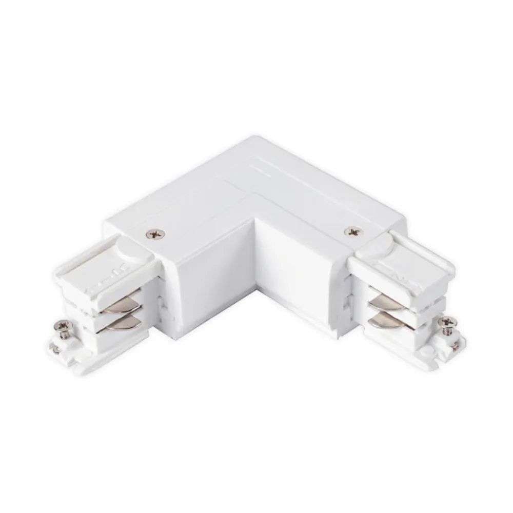 L-forbinder til plastskinnesystem – jord udvendigt Denne L-forbinder bruges til at supplere et 3-faset skinnesystem. Den er lavet af plast og er hvid i farven.