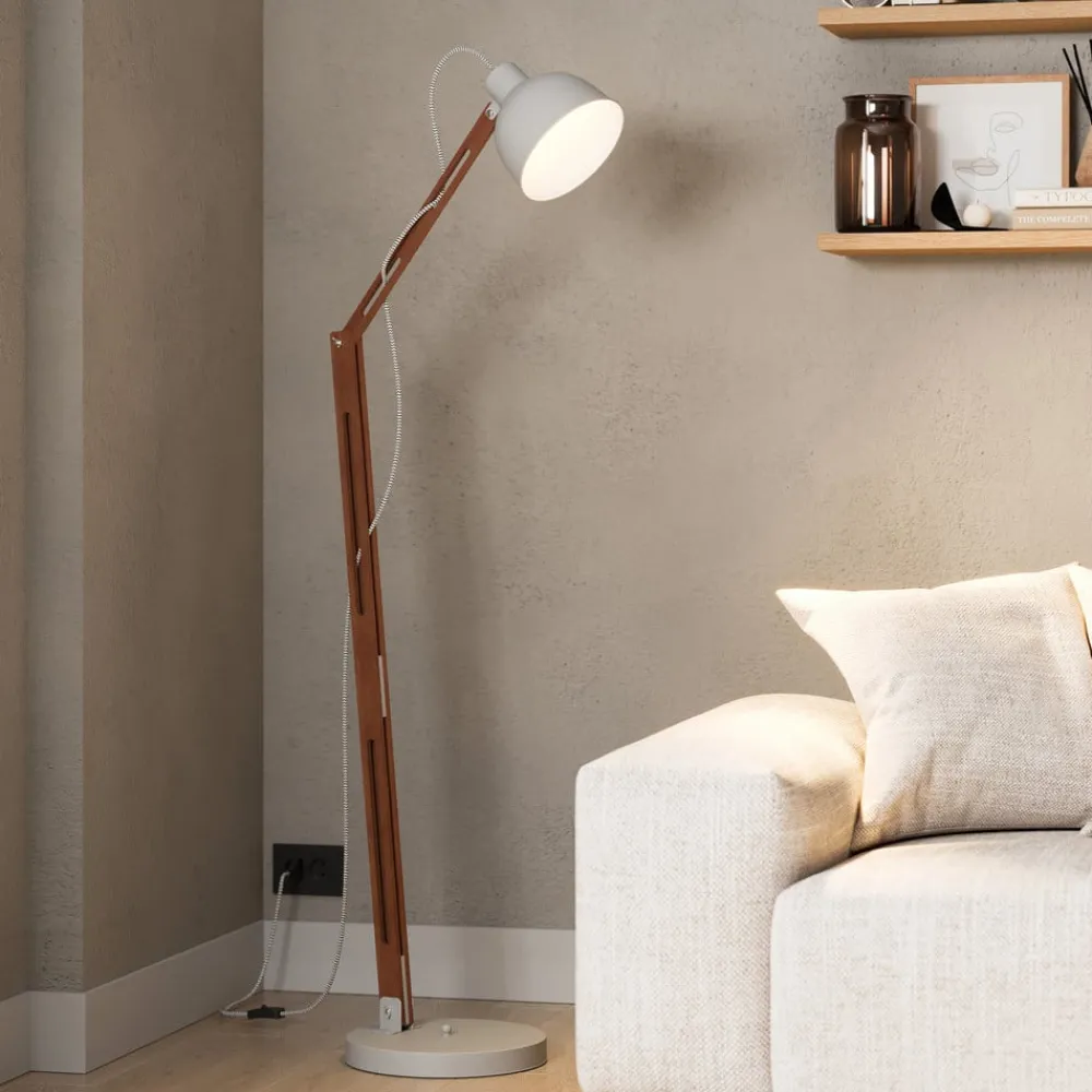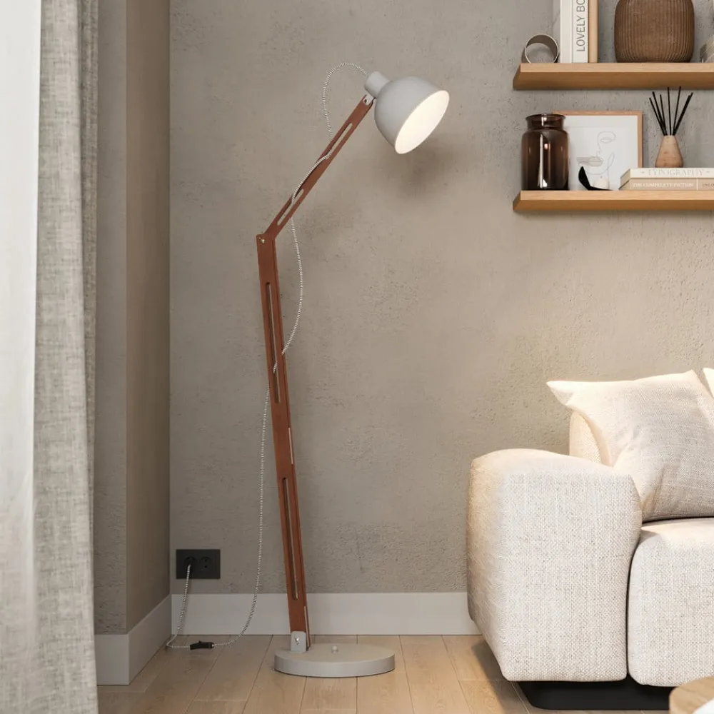 Gulvlampen Skansen kombinerer industrielt design med funktionel fleksibilitet. Lampen er fremstillet af en harmonisk kombination af træ og metal og passer perfekt ind i moderne stuer og spisestuer. Den grå farve i kombination med mørkt træ giver lampen en tidløs elegance, der fungerer både som dekorativt element og praktisk lyskilde.