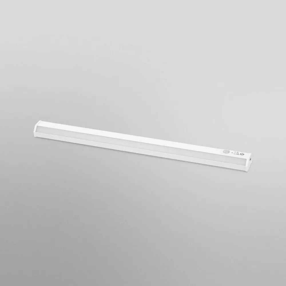 Underskabslampe til fleksibel montering, med bevægelsessensor, indirekte belysning, batteridrevet, genopladelig. Produktegenskaber: Genopladeligt batteri via USB-kabel. PIR-bevægelsessensor og dagslyssensor. Farvetemperatur: 4.000 K. Produktfordele: Tilbehør til fleksible monteringsmuligheder medfølger. Blødt lys gennem indirekte lysfordeling. Anvendelsesområder: Overskabe. Hylde- og underskabsbelysning. Køkkener, arbejdsområder. Kun til indendørs belysning. Teknisk udstyr: USB-opladerkabel.