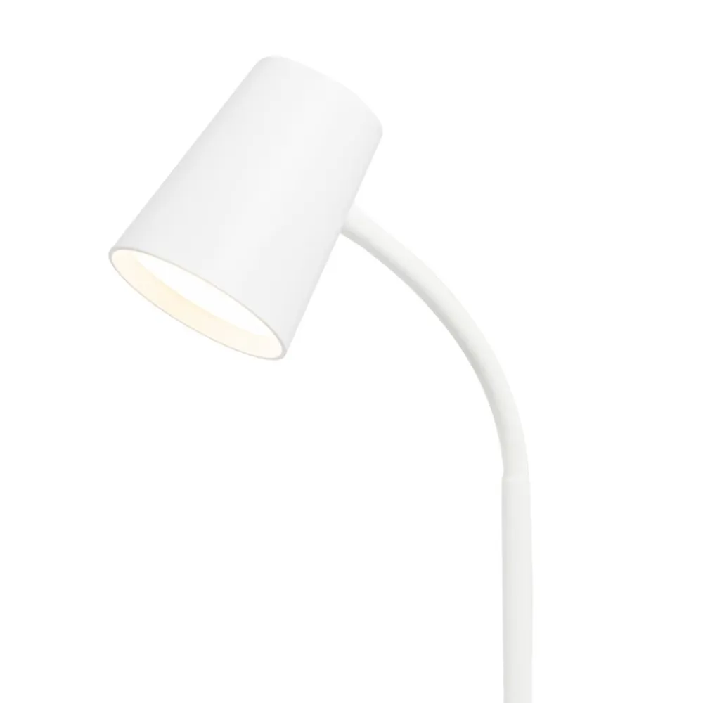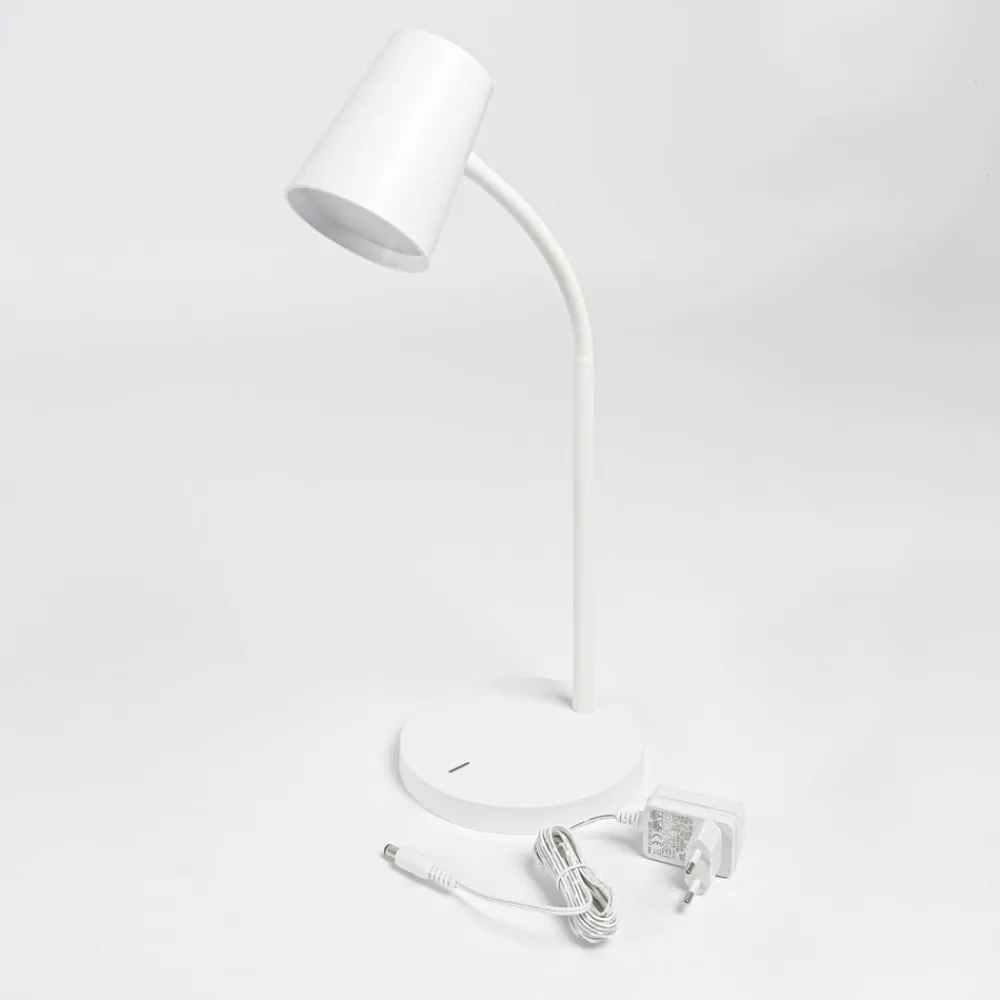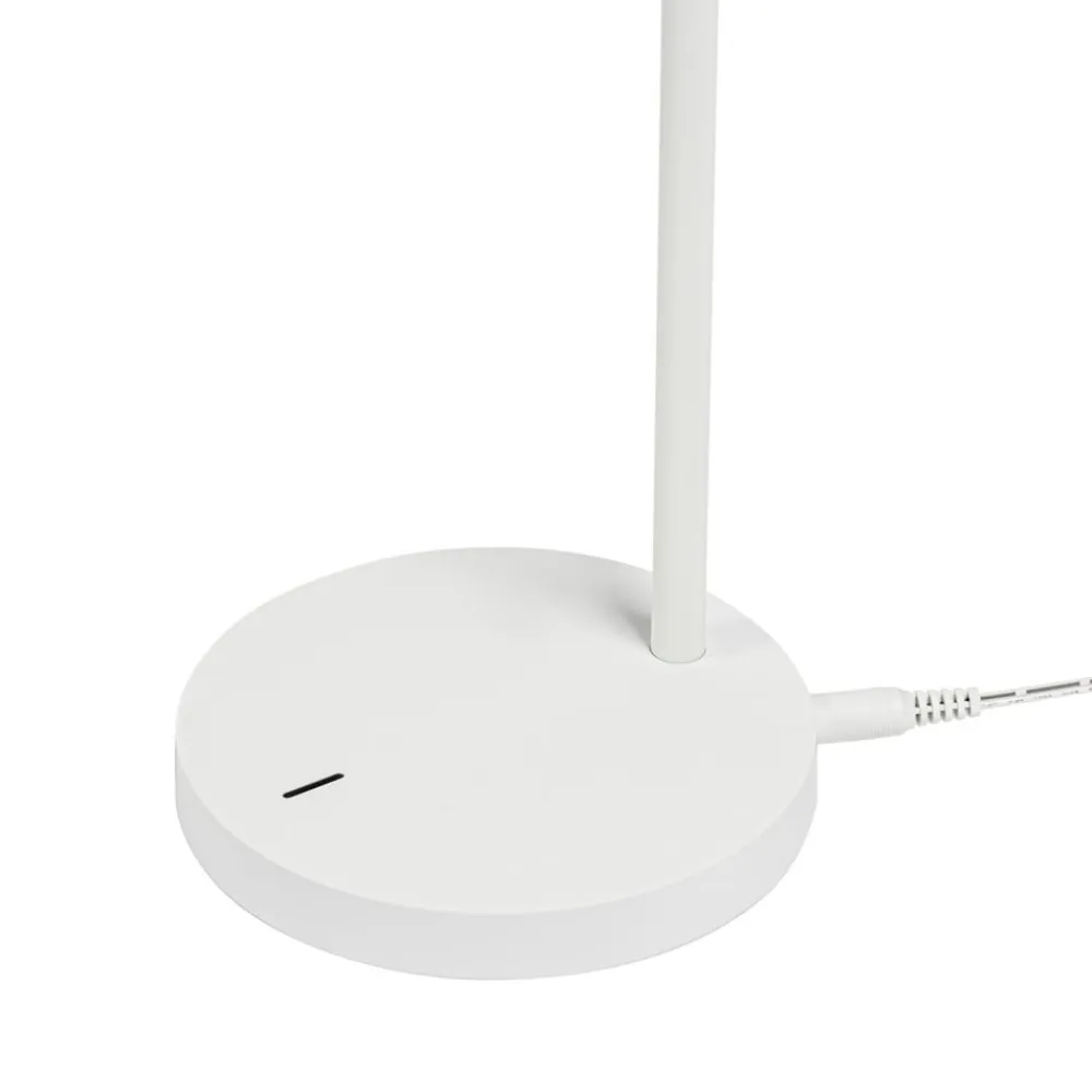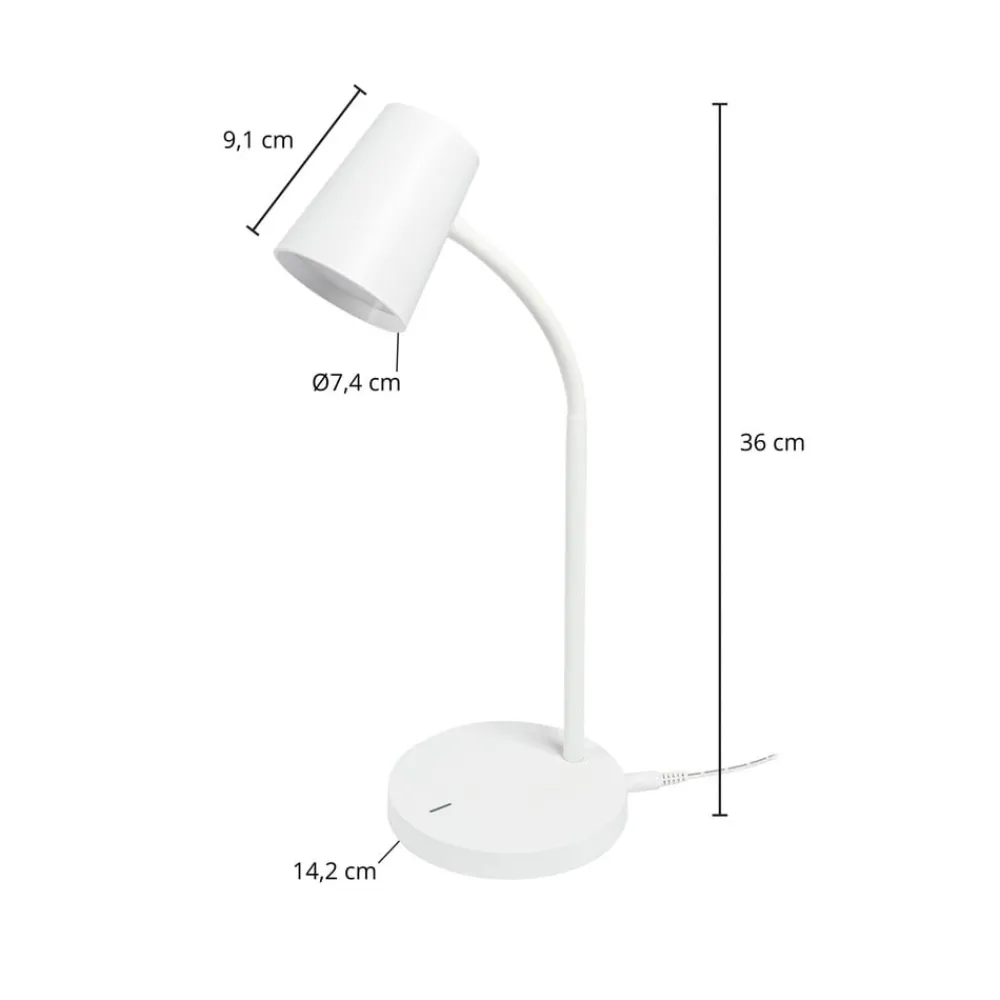 Tidløst smuk LED-bordlampe Ailina med touchdæmper og hvid overflade Ailina er en elegant LED-bordlampe med en fleksibel arm i toppen, så lyset kan justeres og indstilles individuelt efter behov. Skrivebordslampens krop er helt hvid, og basen er rund, ligesom den cylindriske skærm. Lysstyrken kan justeres i tre trin ved hjælp af en integreret berøringsdæmper og kontakt, og lampen gør en god figur både på skrivebordet og andre steder i boligen.