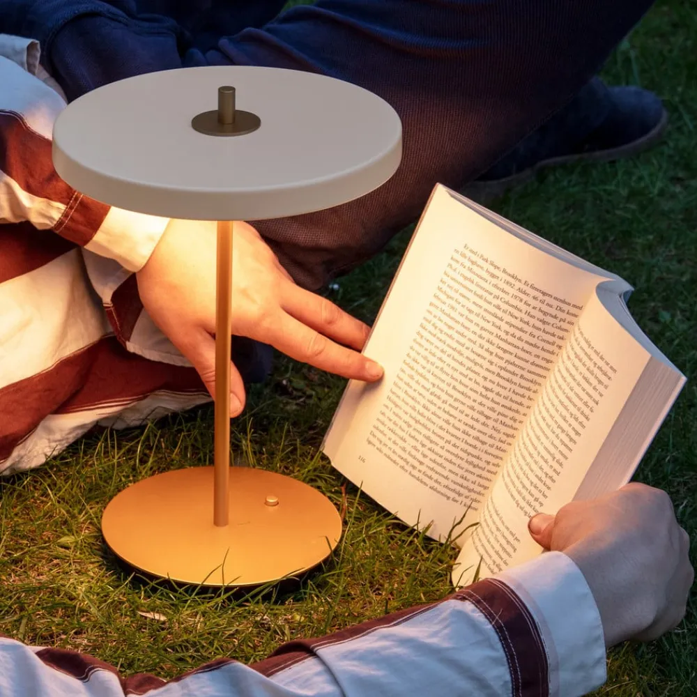 LED-bordlampe Asteria Move med genopladeligt batteri til bærbar funktion Graciøs og udstyret med utrolig bevægelsesfrihed kan LED-bordlampen Asteria Move fra det danske designhus UMAGE bruges overalt i hjemmet. Takket være det indbyggede lithium-ion-batteri kan lampen give lys i op til 35 timer i gennemsnit uden strømtilslutning. Den runde lampeskærm huser varmhvide LED’er, der udsender et hyggeligt og behageligt lys, som er blændfrit, blødt og jævnt fordelt til alle sider takket være den integrerede diffuser. Med touch-dæmperen på den runde, massive base kan lyset dæmper til fire forskellige lysstyrker ved at trykke flere gange på kontakten. Asteria-kollektionen er designet af medstifter og kreativ chefudvikler Søren Ravn Christensen. Designeren er autodidakt og har en sjælden evne til at kombinere design og økonomi. Han siger om sin kollektion: “Asteria-kollektionen, der er skabt i krydsfeltet mellem design, teknologi og håndværk, har integrerede LED-lys i en slank, minimalistisk form.” Sammen med den nuværende administrerende direktør, Jacob Nannestad Hansen, grundlagde Christensen virksomheden UMAGE by VITA copenhagen i 2008. Producenterne af designerlamper lægger særlig vægt på bæredygtige materialer og teknologi af høj kvalitet i produktionen af deres armaturer for at give kunderne det størst mulige udbytte. Konceptet er en succes. I dag har den danske belysningsvirksomhed over 1.500 afdelinger i mere end 50 lande verden over – bærbar – batteridrevet – lysstyrken kan justeres i fire niveauer: 1. niveau 5 lumen ca. 168 timer 2. niveau 20 lumen ca. 50 timer 3. niveau 50 lumen ca. 20 timer 4. niveau 100 lumen ca. 10 timer