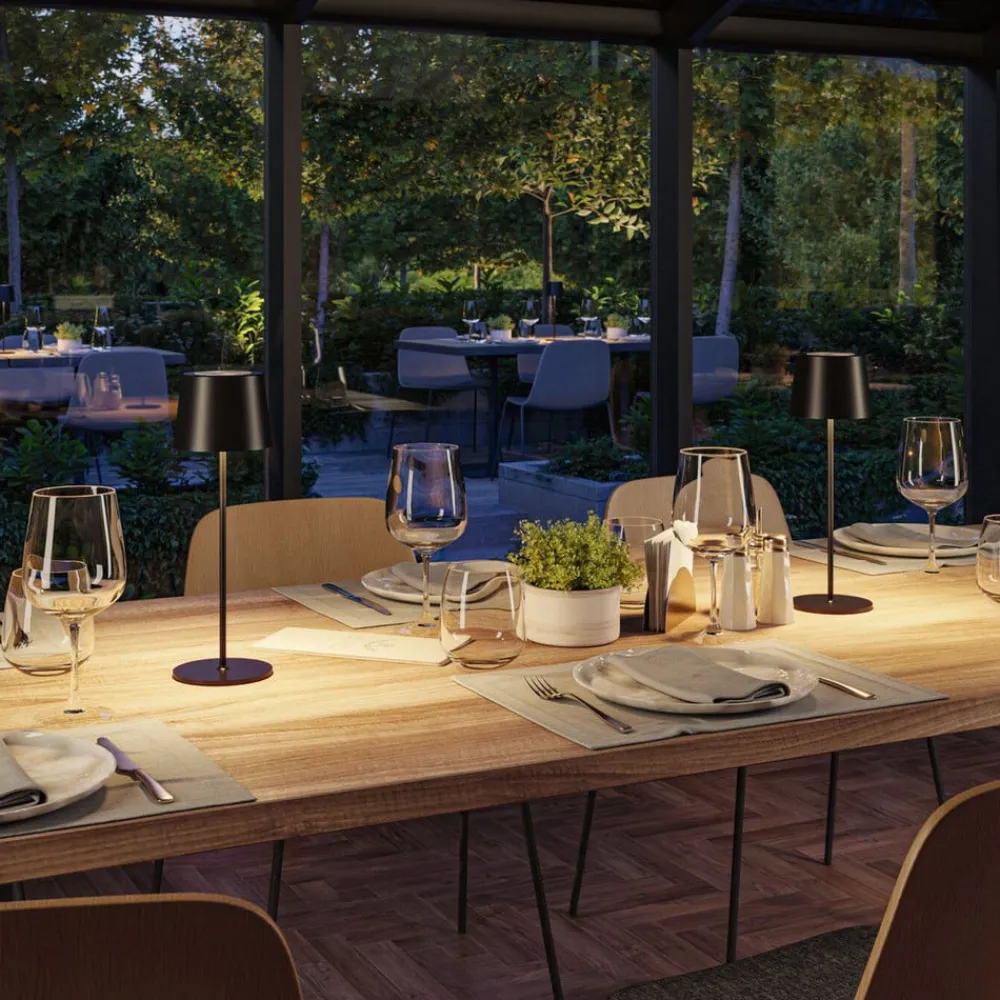 Mobil LED-bordlampe Gilo med genopladeligt batteri, skærm udformet som en keglestub Bordlampen Gilo er en visuelt elegant ekstra lyskilde til indendørs og udendørs brug. Lampen er lavet af plast med en mat finish og består af en rund base, en slank stang og en skærm i en tidløs kegleform. Sidstnævnte er udstyret med en satineret diffuser i top og bund. Takket være det genopladelige batteri kan Gilo betjenes uden strømtilslutning og genoplades indendørs i et tørt miljø ved hjælp af opladningsindgangen USB-C. – IP44 kapslingsgrad – egnet til udendørs brug – LED-modul og batteri kan udskiftes af en specialist – dæmpningsniveauer: 100 %, 10 % – driftstid pr. batteriopladning: > 8 timer ved 100 %, > 50 timer ved 10 % – opladningstid: 6 til 7 timer (inklusive opladningsindikator) – inklusive USB-opladningskabel; uden netadapter