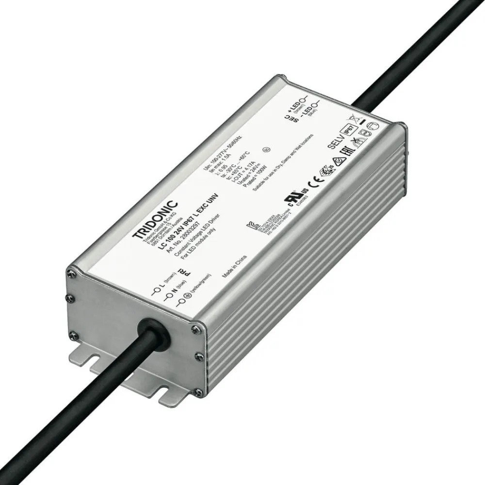 LED-driver LC 24V udgangskonstant IP67 L EXC UNV fra TRIDONIC – forskellige indgangsspændinger mulige, beskyttet mod vand Denne driver til indbygningsarmaturer til 24V LED’er er også velegnet til brug i fugtige miljøer, for eksempel til udendørs belysning. En særlig egenskab er muligheden for tilslutning til et bredt netspændingsområde. Det indkapslede aluminiumshus giver øget beskyttelse mod korrosion, og ind- og udgangskabler med kappe er også tilgængelige.