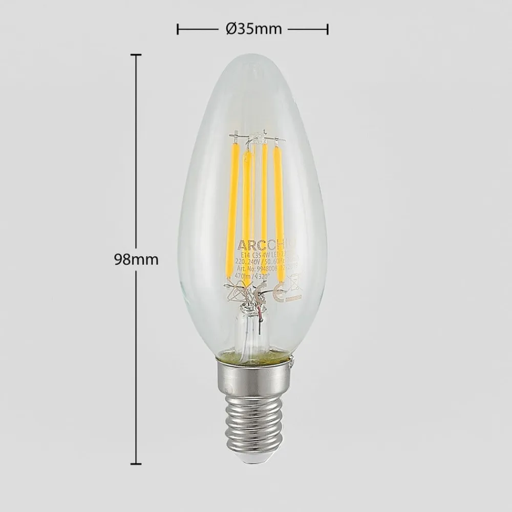 LED-lysestage E14 4W glødetråd, 2.700K, dæmpbar i et sæt af 3Med den eksisterende lyskontakt kan denne pære ikke kun tændes og slukkes, men også skiftes til tre lysstyrkeniveauer (100%, 55% og 20%).Den dekorative lysestage med klart glas og glødetrådsteknologi er perfekt til lysekroner og åbent designede armaturer.- Pæren leveres i et praktisk sæt af 3