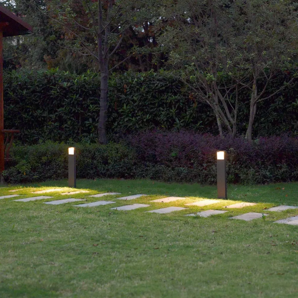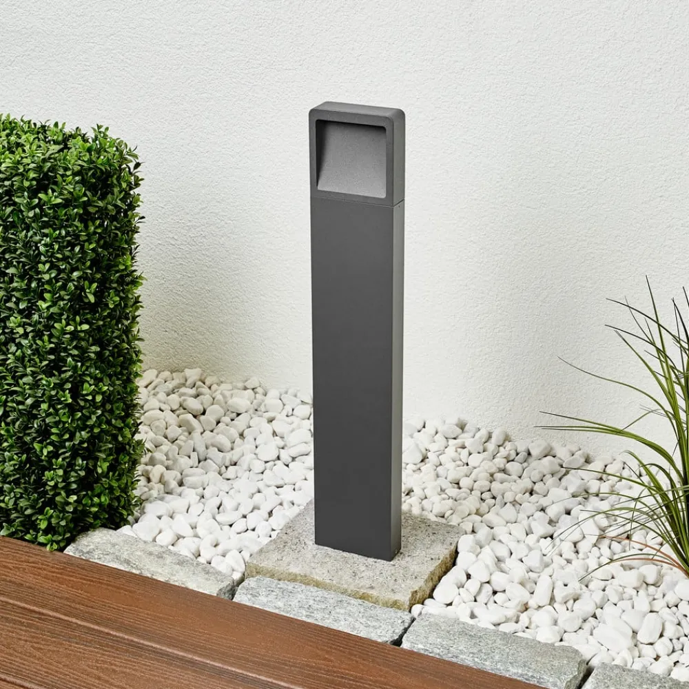 Elegant LED-gadelampe Leya i tidløs grafitgrå Denne LED-gadelampe er lavet af trykstøbt aluminium, malet grafitgrå, og har et attraktivt design, der passer perfekt til en moderne udendørs atmosfære. Den trykstøbte aluminiumsramme er overvejende lineær og enkel på en moderne måde, men har afrundede hjørner som et særligt træk, der gør det samlede udseende endnu mere harmonisk. Lyset udsendes kun indirekte, da der er en fordybning i kroppen i toppen af armaturet, og LED-pærerne er placeret direkte under toppen af armaturet og lyser derfor nedad. Et stilfuldt belysningsobjekt, der altid gør en god figur i moderne udendørsområder.