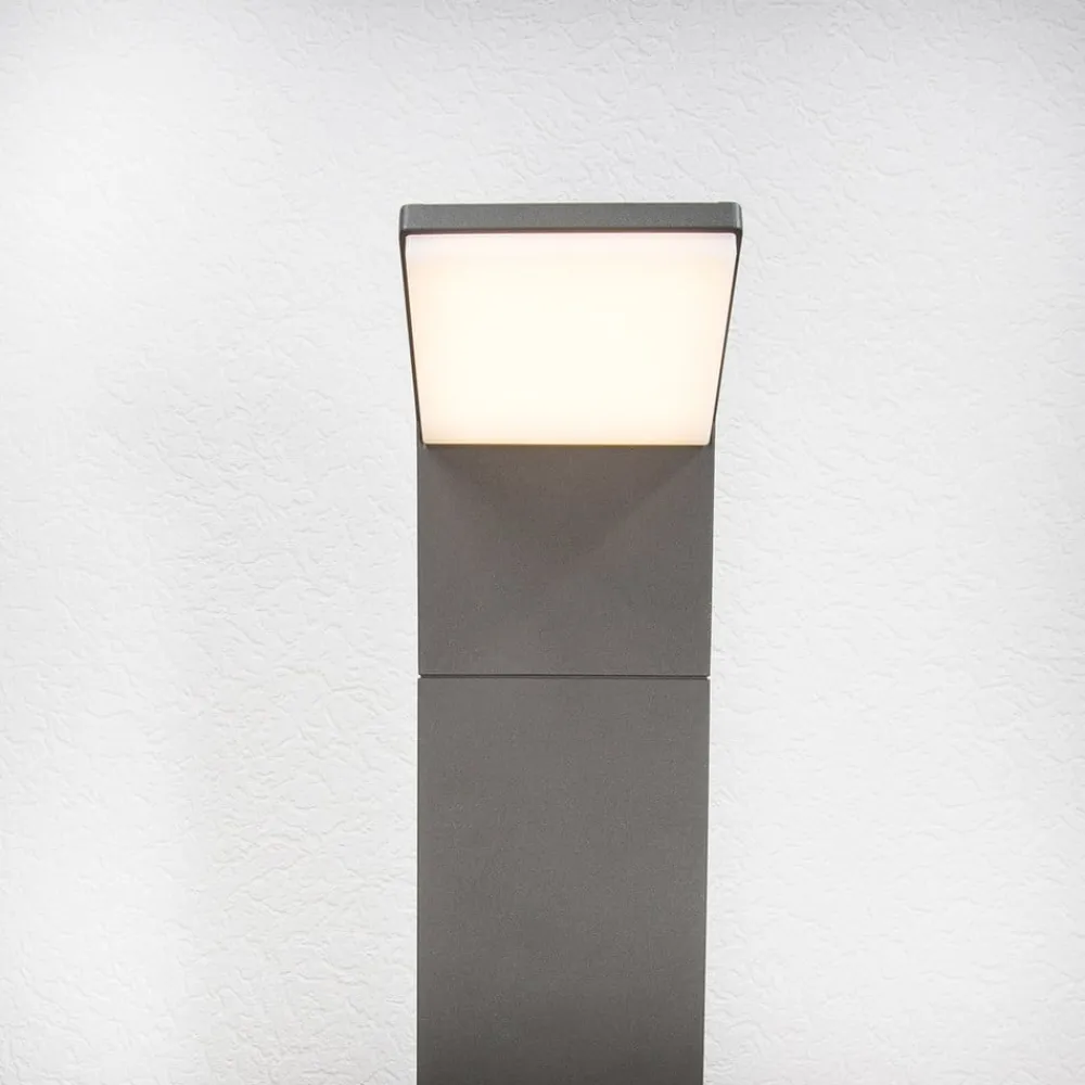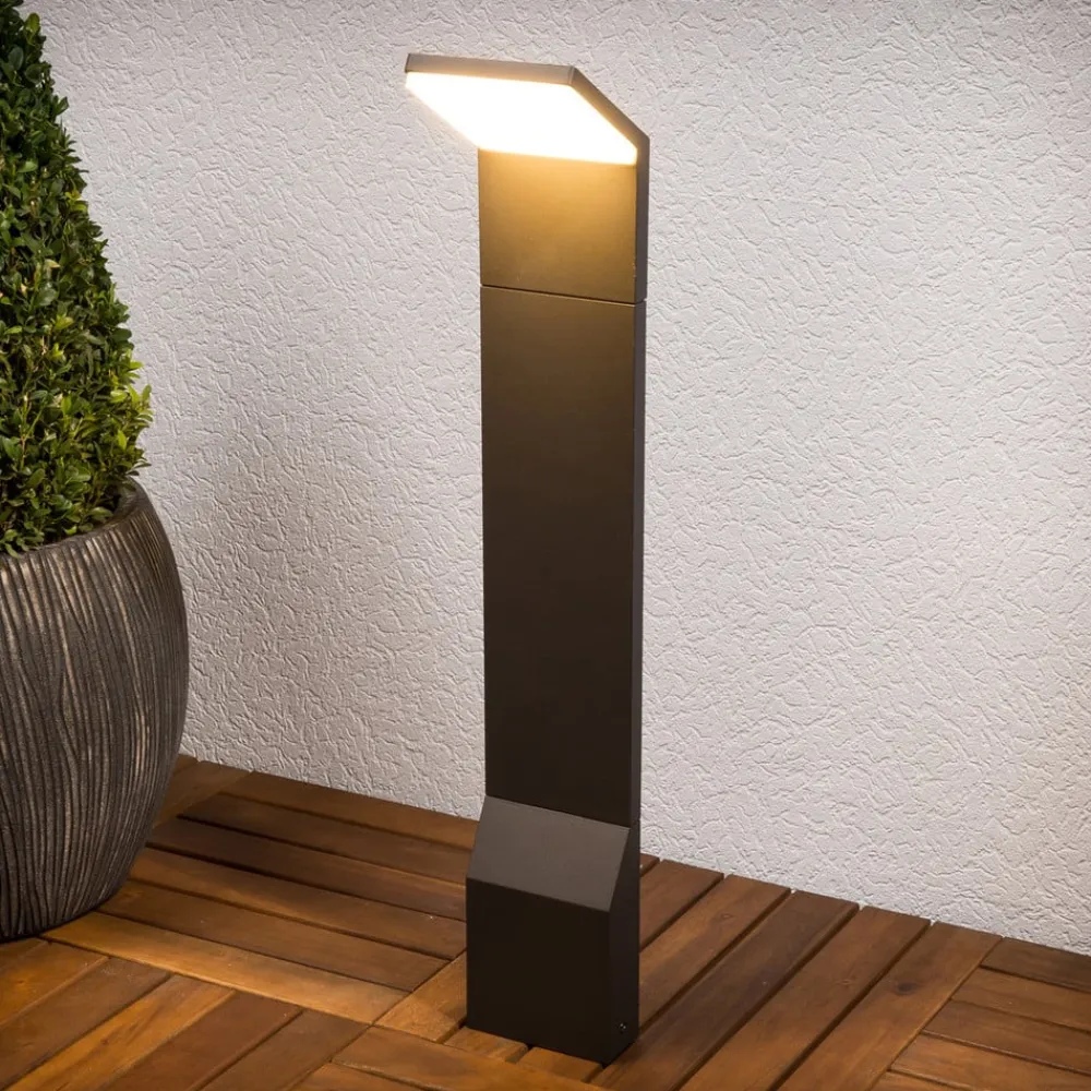 Nedadrettet LED-gadelampe Nevio til moderne udendørsbelysning Denne LED-gadelampe udsender lys nedad, da det rektangulære lampehoved hælder ca. 45°. Det passer perfekt til den rektangulære ramme og er på undersiden dækket af en hvid plastdiffusor, som skaber en ensartet og blændfri lyseffekt. De integrerede, varmhvide LED’er er et mærkevareprodukt fra Epistar og er ikke kun kendetegnet ved en lang levetid, men også ved høj energieffektivitet, hvilket er helt i tråd med moderne miljøbevidsthed.