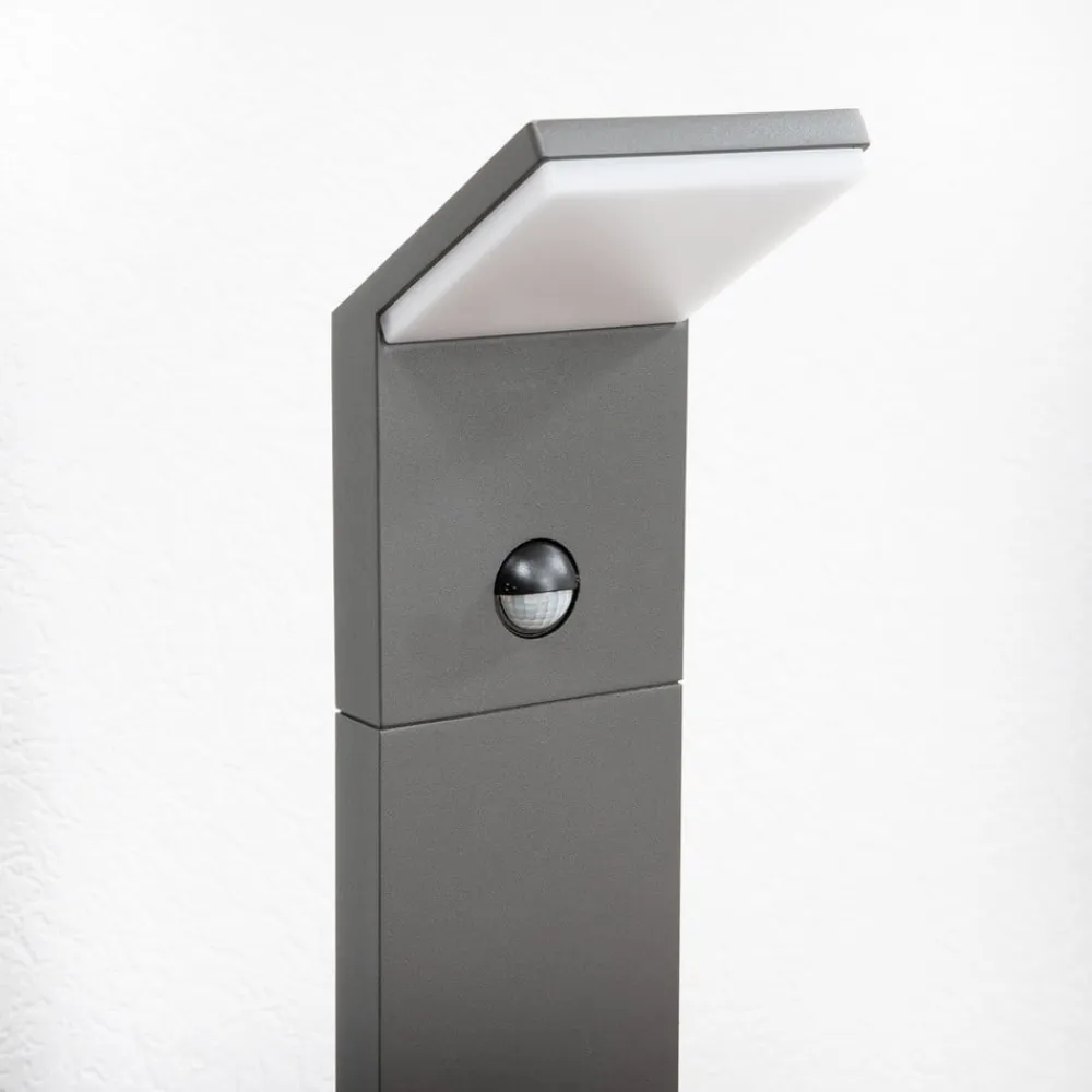 Moderne designet Nevio LED-projektorlampe med bevægelsessensor Den integrerede bevægelsessensor øger funktionaliteten af denne LED-vejlampe til udendørs brug. Nevio LED-vejlampen vil helt sikkert finde en passende plads ved siden af moderne bygninger, og det fantastiske er, at den bruger meget lidt energi, hvilket sikres ved brug af LED’er. Lampehovedet er let skråtstillet, så lyset hovedsageligt udsendes mod gulvet. Tilstedeværelsesdetektoren registrerer bevægelse i en vinkel på op til 120°, har en maksimal rækkevidde på 9 meter og kan indstilles til at lyse i mindst 5 sekunder og højst 8 minutter (efter at bevægelsen er registreret).