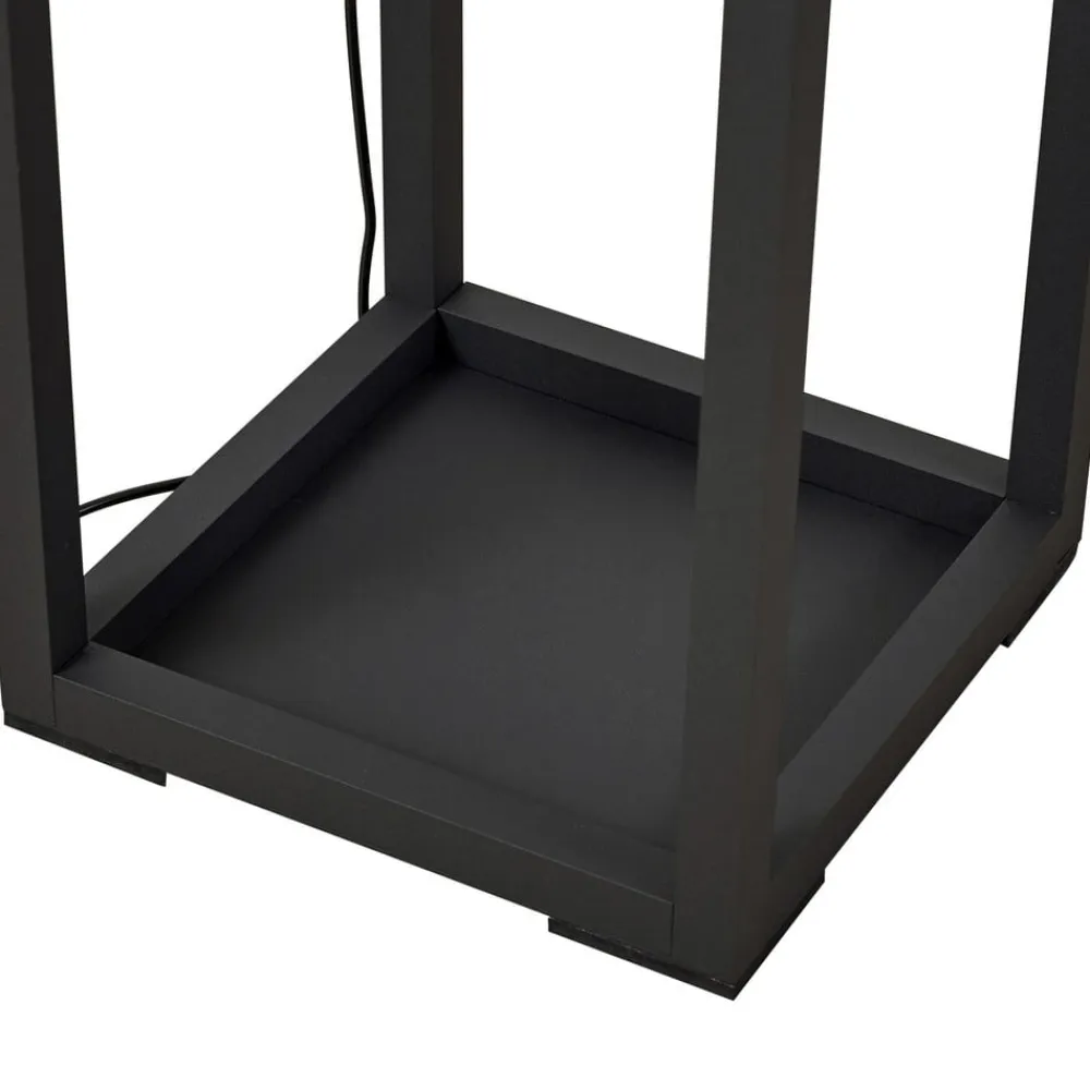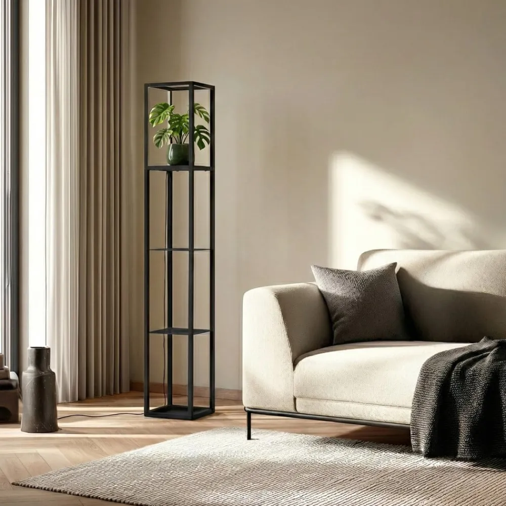 Sort, kantet LED-gulvlampe til kontor i form af en reol