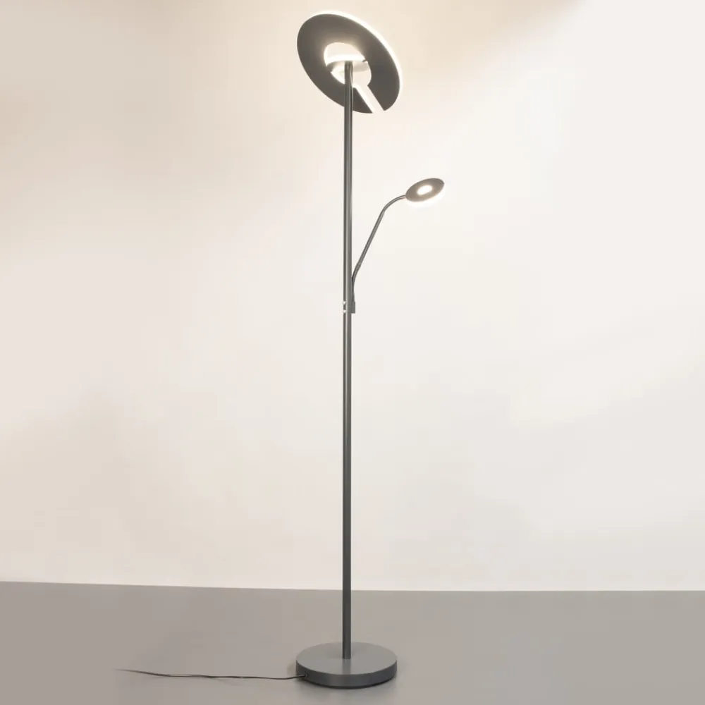 LED-gulvlampen Dent forener moderne design med funktionel belysning. Den er fremstillet af metal og glas og passer perfekt ind i moderne indrettede stuer og spisestuer. Den integrerede LED-lyskilde tilbyder en imponerende farvevariation takket være CCT-funktionen, der spænder fra varmhvidt lys til universalhvidt lys. Denne alsidighed gør det muligt at tilpasse lysstemningen efter behov og dermed skabe en behagelig atmosfære. Læselampe og hovedbelysning kan tændes separat.