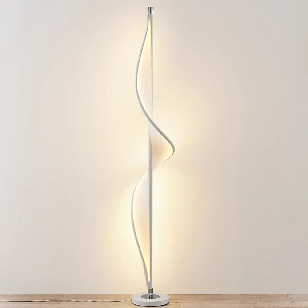 Edano LED-gulvlampe med hvid lampeskærm i tekstil, dæmpbar i tre trin Edano LED-gulvlampen har et meget usædvanligt design. Dens hvide tekstilskærm snor sig som et stykke stof fra top til bund rundt om det tårnhøje stel og giver indtryk af, at stoffet hvirvles op af vinden. Det hvide stof oplyses af varmhvide LED’er, som gør hele strukturen endnu mere effektiv, når lyset er tændt. Men selv når den er slukket, er Edano LED-gulvlampe ekstremt dekorativ takket være sin unikke form og effektive lampeskærm, hvilket gør den til et designobjekt i stuen. Edano LED-gulvlampe af aluminium og hvidt stof passer særligt godt ind i moderne interiører takket være sit usædvanlige design. Den betjenes nemt med foden ved hjælp af kontakten, der er integreret i kablet. 3-trins dæmpbar + off: Kontakten gør det muligt at tænde og slukke lyset som normalt. Takket være 3-trins-dæmpningsteknologien med integreret slukfunktion kan den også dæmmes til tre forskellige lysstyrkeniveauer ved at trykke på kontakten flere gange: 100 %, 50 % og 10 %.