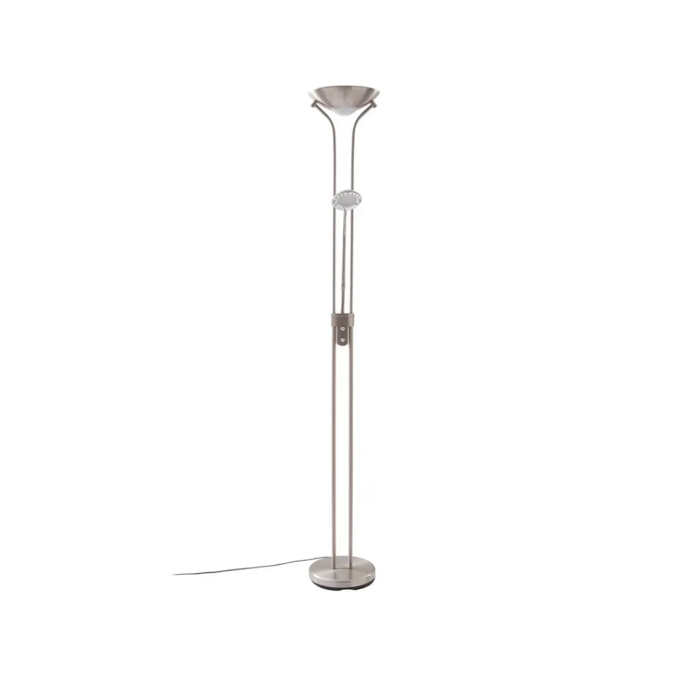 Josefin metal LED-uplight med nikkelfinish og praktisk læselampe Josefin LED-uplight er en dæmpbar lyskilde, som er en meget anbefalelsesværdig tilføjelse til stuen. På den ene side er der uplighten, som giver et vidunderligt hyggeligt lys, og på den anden side er der integreret en læselampe i det samlede koncept. Den er placeret på en arm, der strækker sig ud fra lampen i ca. midt rammehøjde. Hvis man f.eks. har LED-uplighten ved siden af sofaen, er LED-læselampen, som også drives af LED’er, et godt bidrag, når man vil hente et magasin eller læse videre i en bog, fordi den giver et præcist lys med god lysstyrke, så øjnene aflastes, mens man læser. De to dimmere, som kan betjenes separat, er placeret i midten af rammen og er velegnede til trinløs justering af lysstyrken.