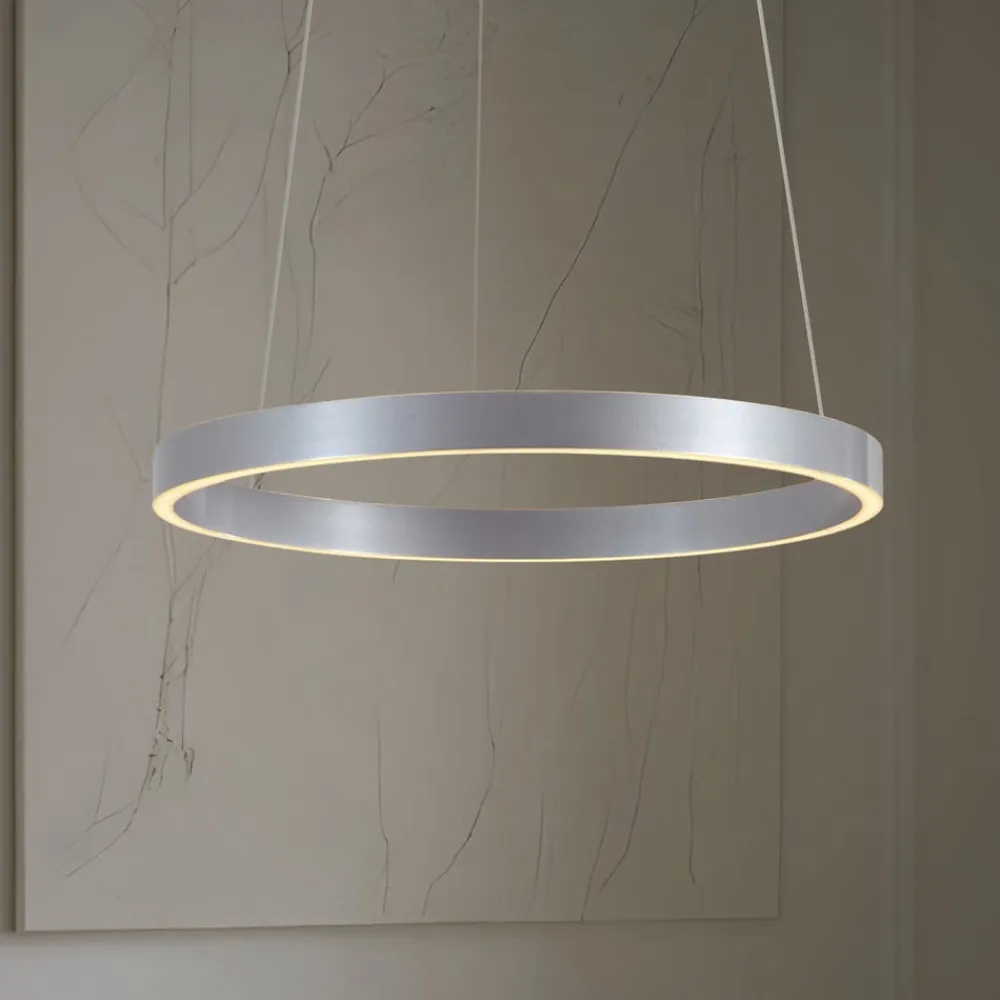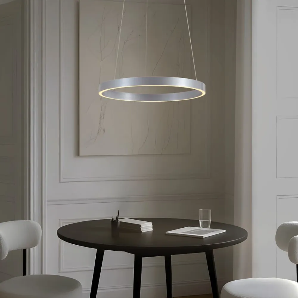 LED-hængelampe Yonam imponerer med sit moderne design og brugen af holdbare materialer som metal og silikone. Med sin elegante aluminiumsfarvede finish passer den perfekt ind i moderne stuer og spisestuer. Den integrerede LED-lyskilde sikrer en jævn belysning og tilbyder et imponerende farvetemperaturområde fra varmhvid til universalhvid. Farvetemperaturen kan indstilles individuelt i 3 trin fra varmhvid (2.700 K + 3.000 K) til universalhvid (4.000 K).