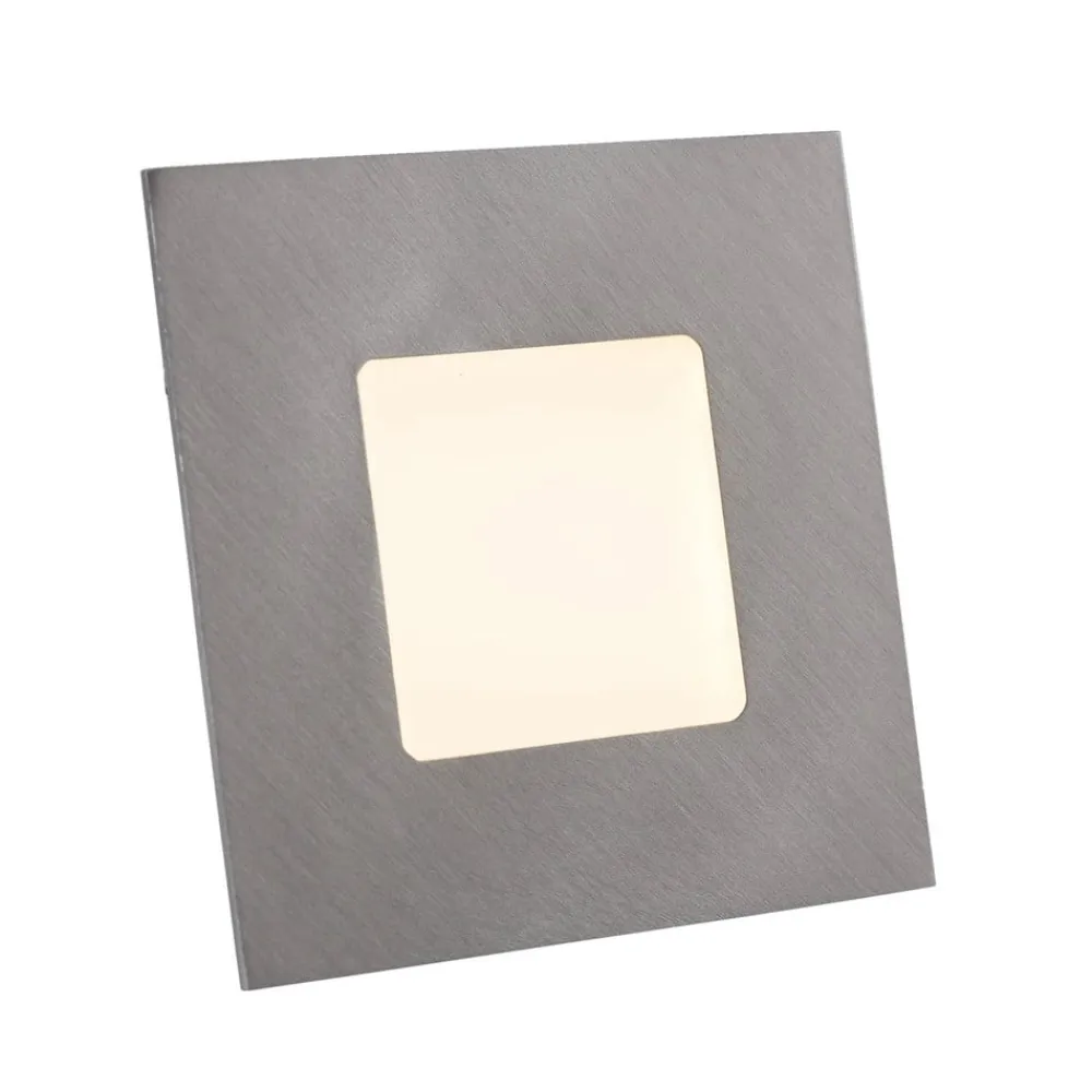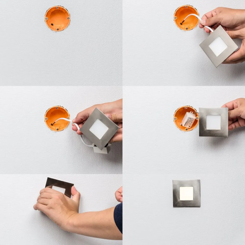 Attraktivt Klaus LED-panel til praktisk installation i afbryderbokse Klaus LED-panelet udsender et varmhvidt lys (33 lumen) med sine permanent installerede 12 LED’er og sætter elegante accenter. Flere Klaus LED-paneler kan kombineres for at skabe et fremragende orienteringslys, f.eks. til belysning af trapper. Huset er lavet af en aluminiumslegering, og ballasten er inkluderet i leveringsomfanget. Den er nem at installere takket være den praktiske boksinstallation – LED-driver (medfølger) – Indbygningsboks (medfølger ikke)