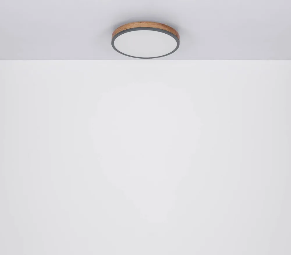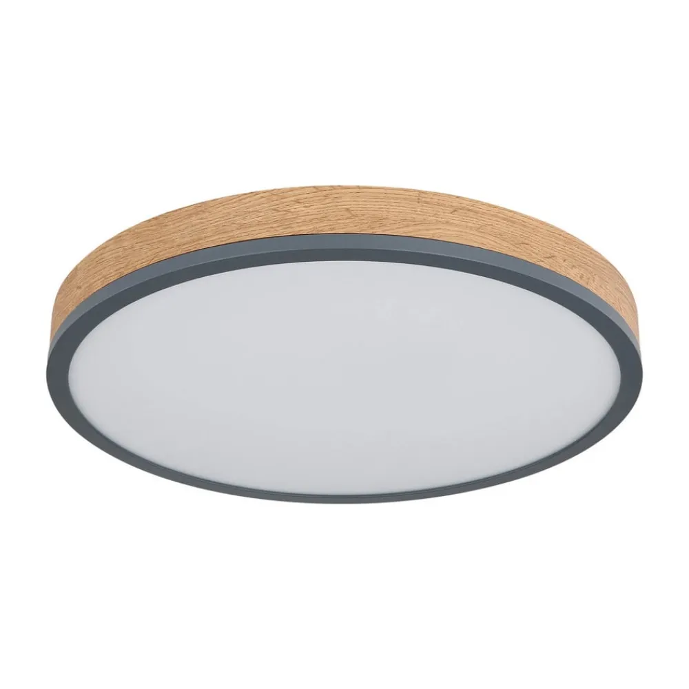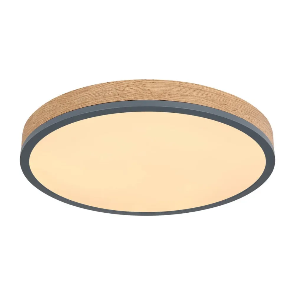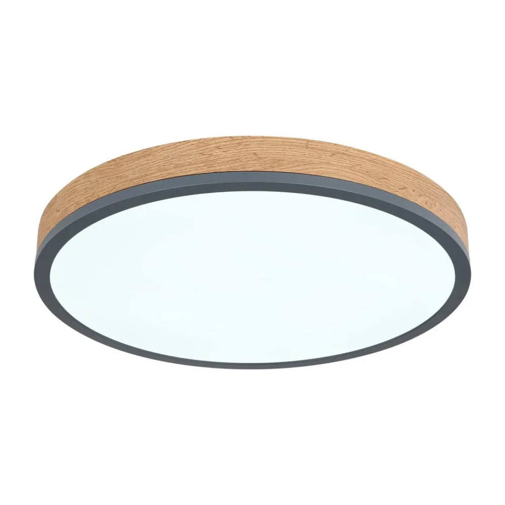 Doro LED-loftlampe med kontrollerbar lysfarve (CCT) Den runde Doro-loftlampe imponerer med sit moderne design. Den opalfarvede plast, der dækker de indbyggede LED-pærer, sikrer et blændfrit lys. Kabinettet af grafitfarvet malet metal og mørkt MDF-træ tilfører en hjemlig nuance til ethvert rum. Lysfarven kan justeres trinløst (varmhvid til dagslys). Udstyret med natlysfunktion og timer. Kan betjenes via den medfølgende fjernbetjening (inkl. to AAA-batterier) eller via den eksterne vægkontakt – Integreret hukommelsesfunktion