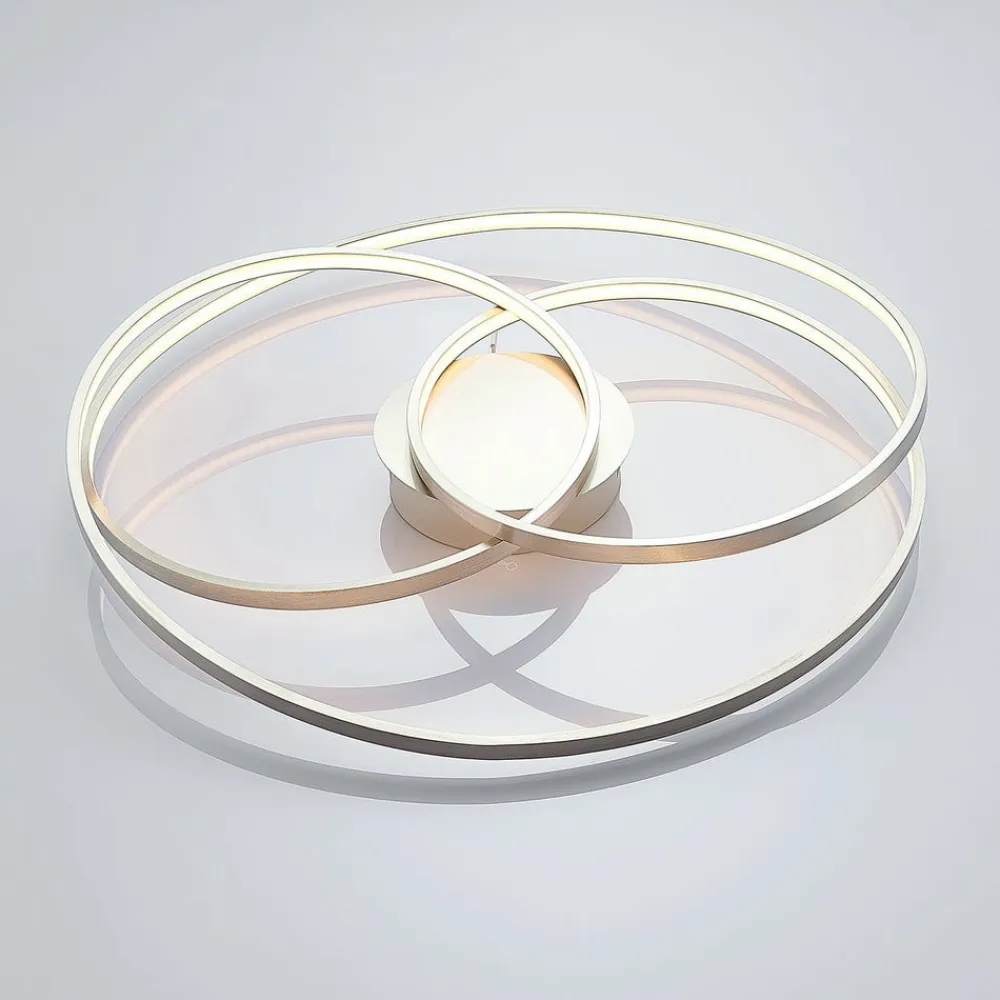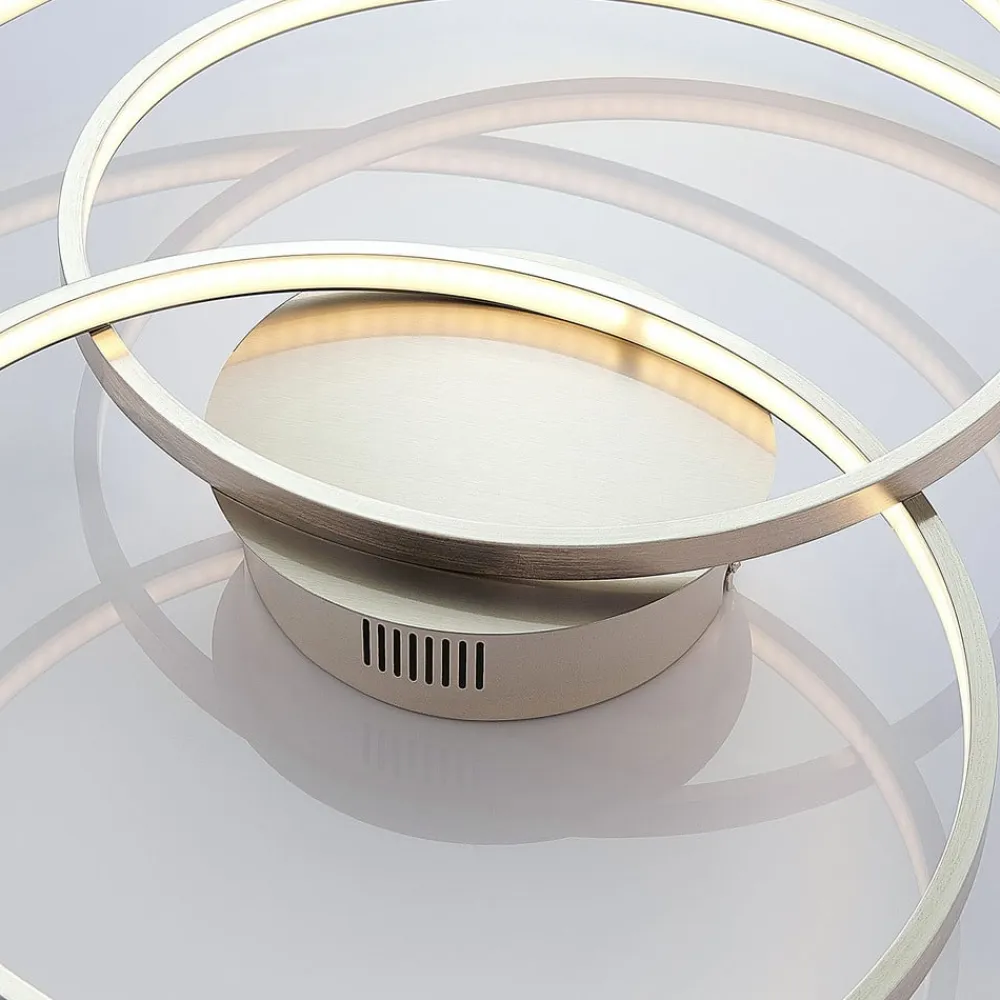 Joline LED-loftlampe, dæmpbar via kontakt, satineret nikkelfinish Joline har spiralformede elementer og er et armatur, der er helt moderne i sin stil. De runde metalkomponenter er fint udformet og har en kølig nikkelfinish med et satinagtigt look. LED’erne vikler sig rundt om spiralen som et bånd, og lysstyrken kan varieres i tre trin ved hjælp af en standard vægkontakt, så den bedre kan tilpasses de lokale forhold.