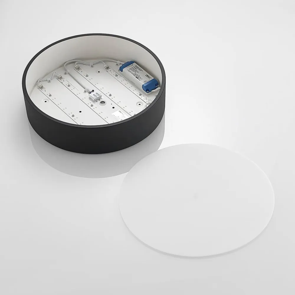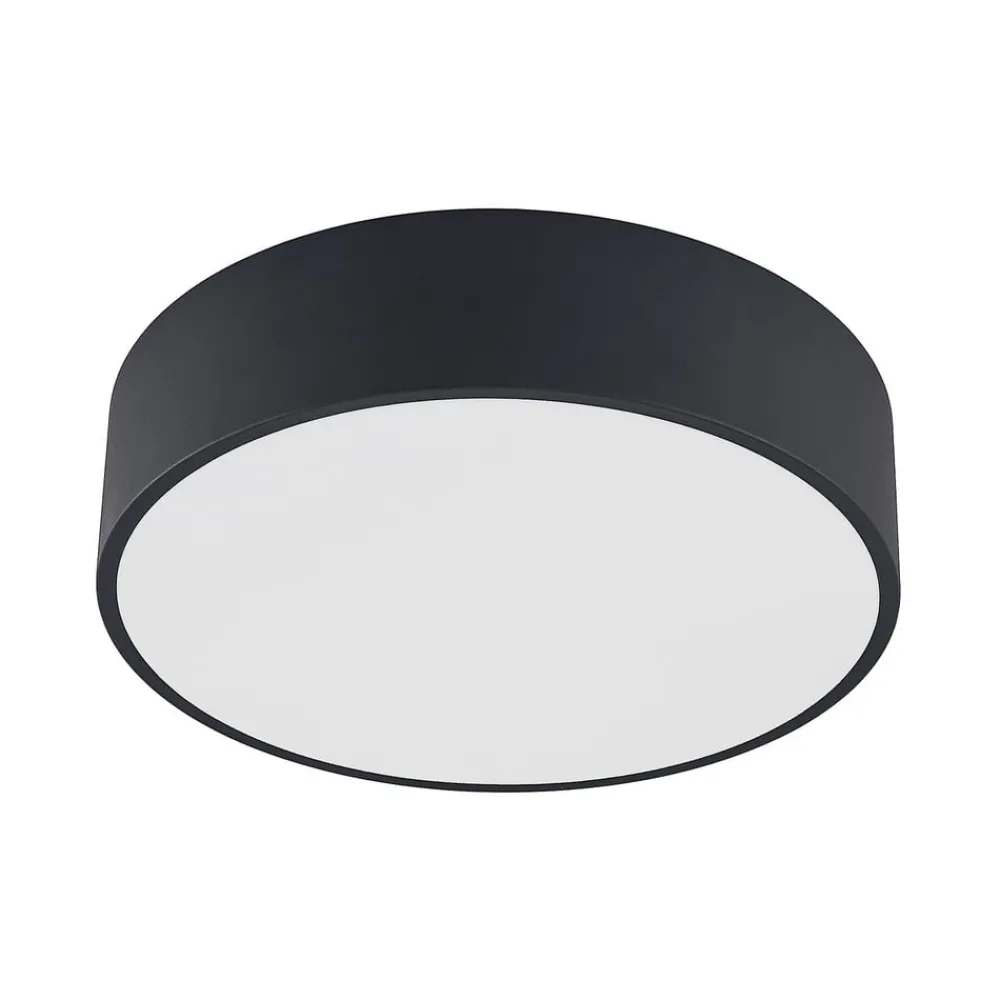 Sort LED-loftlampe Noabelle med metal surround og akryl diffusor, lysfarve justerbar på forhånd