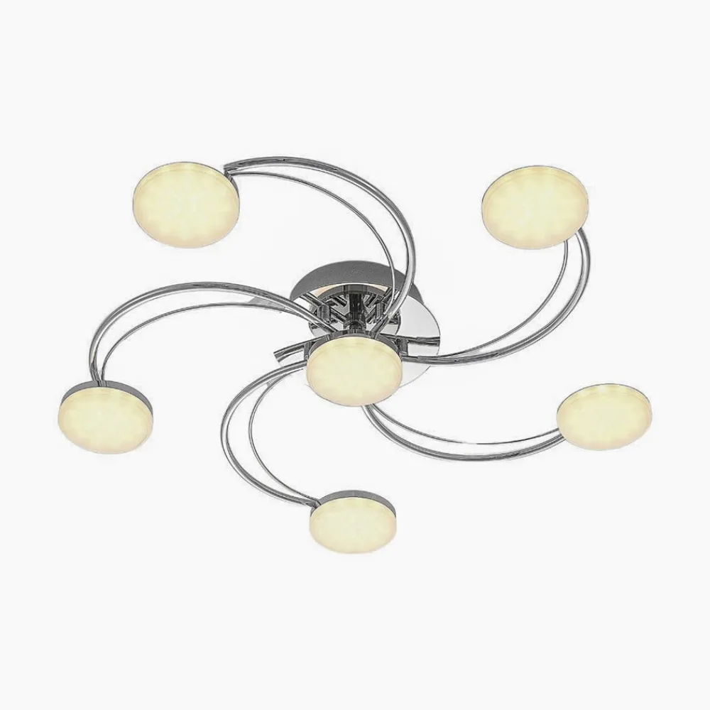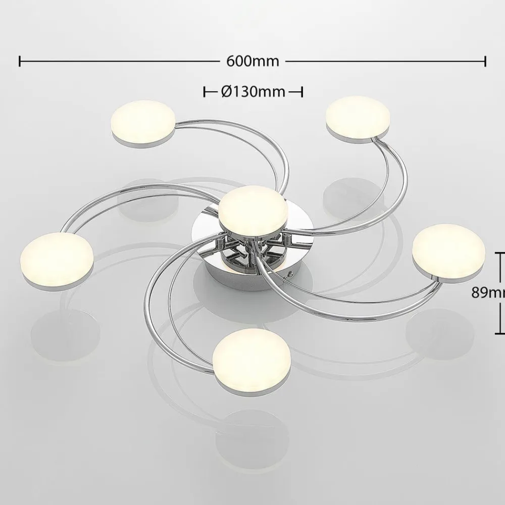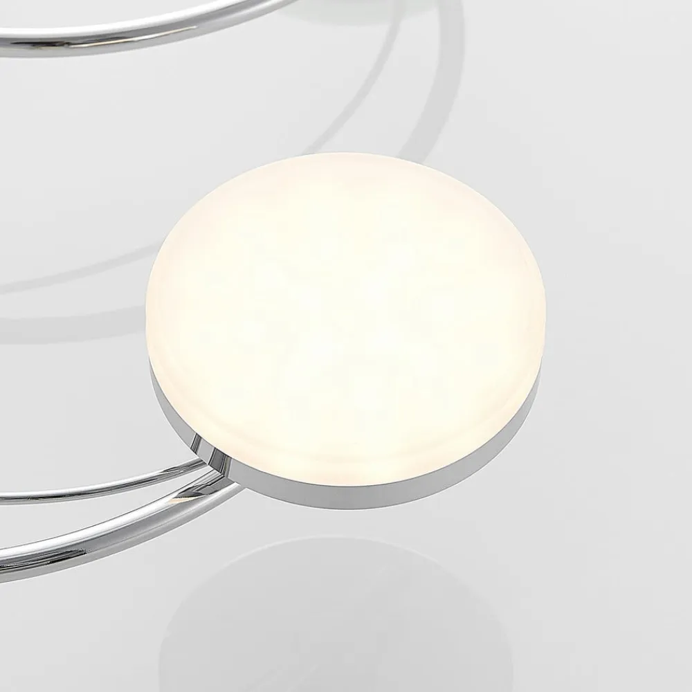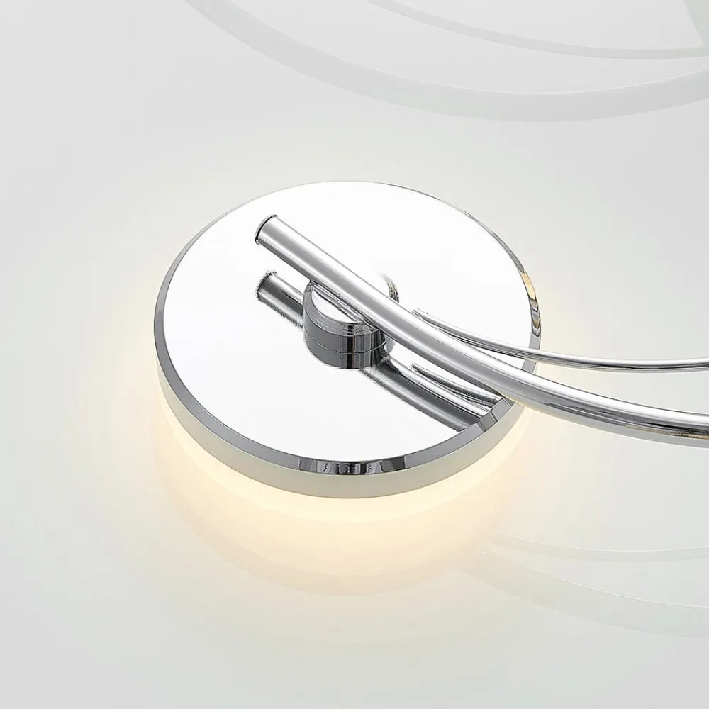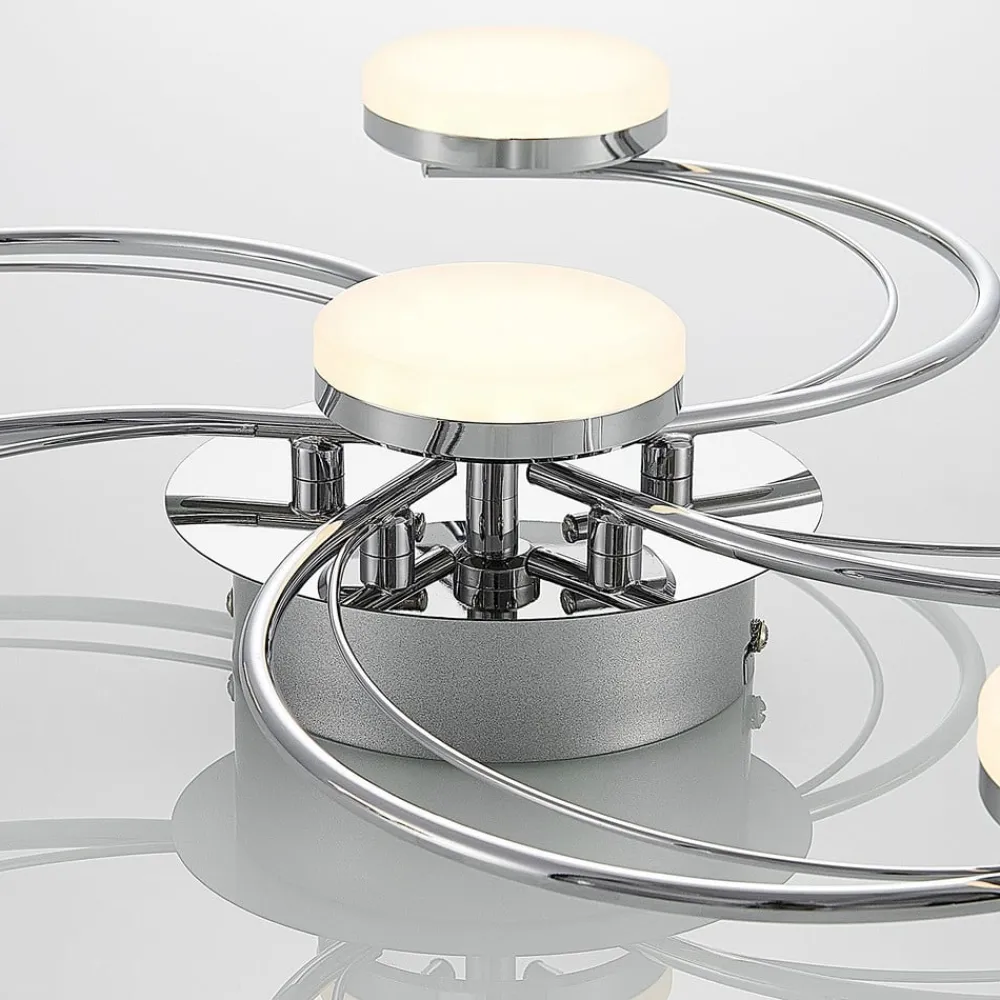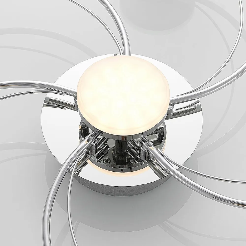 Rouven LED-loftlampe med et smukt spirallook til kraftig belysning Rouven er en moderne LED-loftlampe, der består af fem buede metalstænger. De er arrangeret i en spiral og udført i en smuk kromfarve. LED’erne er placeret bag runde, satiniserede dæksler for enden af metalstængerne. Da en spiral er klassisk rund, supplerer dækslernes cirkulære form perfekt armaturets koncept. Formerne harmonerer og skaber et smukt helhedsudtryk. Samtidig sendes der et behageligt varmt lys ud i rummet, som er stærkt nok til at oplyse større rum jævnt takket være det høje lumenoutput. Rouven er ideel til en moderne stue.