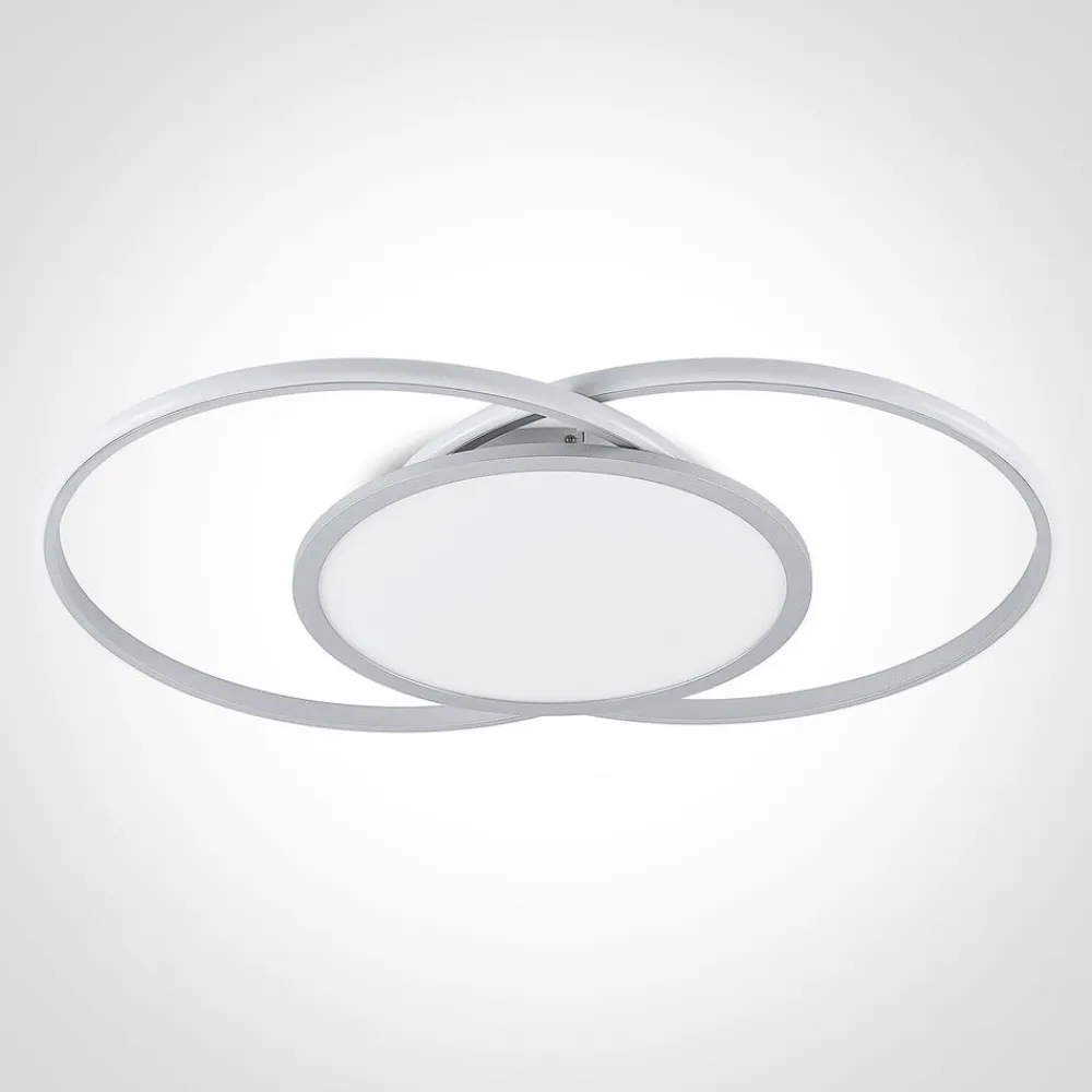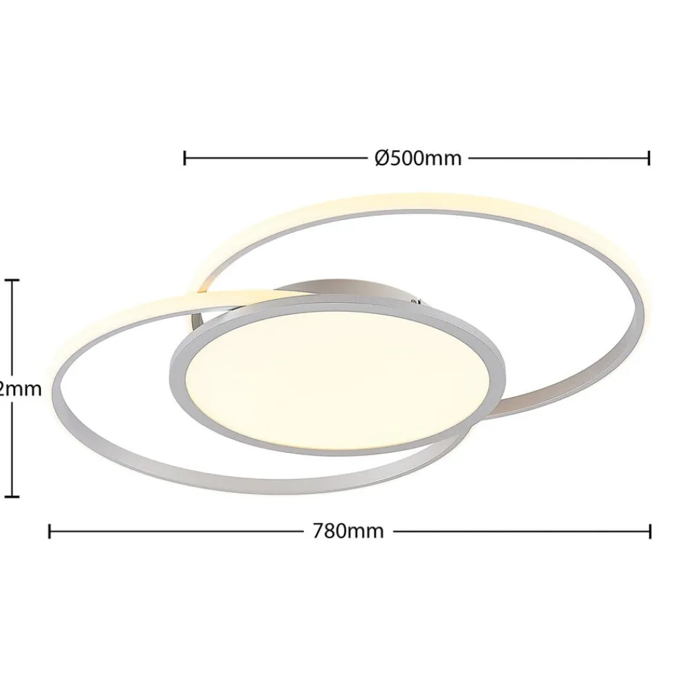 Stilfuld Senne LED-loftlampe i sølv med praktiske funktioner LED-loftlampen Senne kommer i et moderne design og med praktiske funktioner, der gør livet lettere. Lampekroppen er lavet af aluminium og jern og har et interessant mønster, der består af et rundt element og to ringe, der omgiver det. De fastmonterede LED’er kan dæmpes trinløst med hensyn til lysstyrke (10% – 100%) ved hjælp af en vægkontakt eller fjernbetjening, og lysfarven kan også styres lige så nemt (2.700 K, 4.000 K og 6.500 K). Disse funktioner giver LED-loftlampen Senne en vis grad af fleksibilitet og gør den til den perfekte ledsager, når det gælder belysning af en stue. Det stilfulde, moderne ydre kan ubesværet integreres i indretningen uden at overskygge resten af møblerne.
