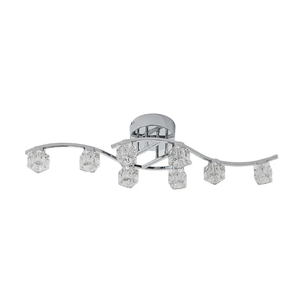 8 lyskilder LED-loftlampe Yaro med klare glaskuber, dæmpbar via kontakt Yaro er ideel til belysning i stuen og ser meget tiltalende ud med sine otte glasskærme i et kompakt design. Loftlampen drives af tredobbelt dæmpbare LED’er, og variationen i lysstyrke kan nemt styres ved hjælp af vægkontakten. Kromrammen supplerer smukt de klare glasskærme.