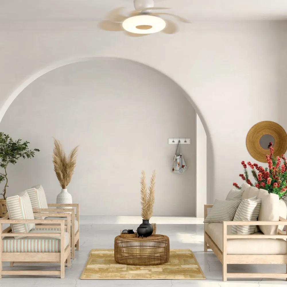 LED-loftventilatoren Flower kombinerer en forfriskende brise med moderne almindelig belysning. De seks vinger af plast er kun udfoldet, når ventilatoren er tændt, og skjules over den runde krop, når ventilatoren er slukket. Sidstnævnte rummer en kraftig LED-lampe, hvis lys kan dæmpes og reguleres i farvetemperatur og stråler ud over et stort område nedad gennem en satineret afskærmning. Betjeningen foregår med den medfølgende fjernbetjening.