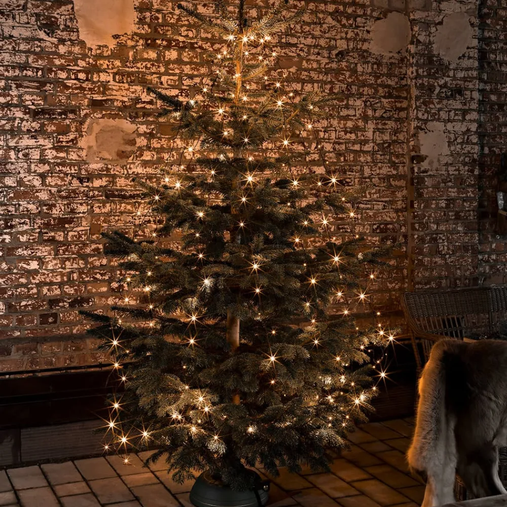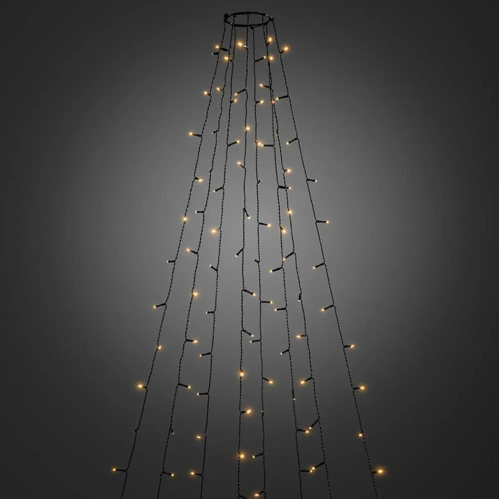 I løbet af nul komma niks får man udsmykket juletræet med masser af små lys – det kan man med denne lyskappe, som blot trækkes ned over træet oppefra. Så pryder otte strenge med hver 30 rav-farvede, lysende LED-pærer træet med deres varme lysglans. Halvdelen af de i alt 240 lysdioder funkler, og det forøger naturligvis dekorationseffekten yderligere. Kablet er sort. En transformator medfølger.