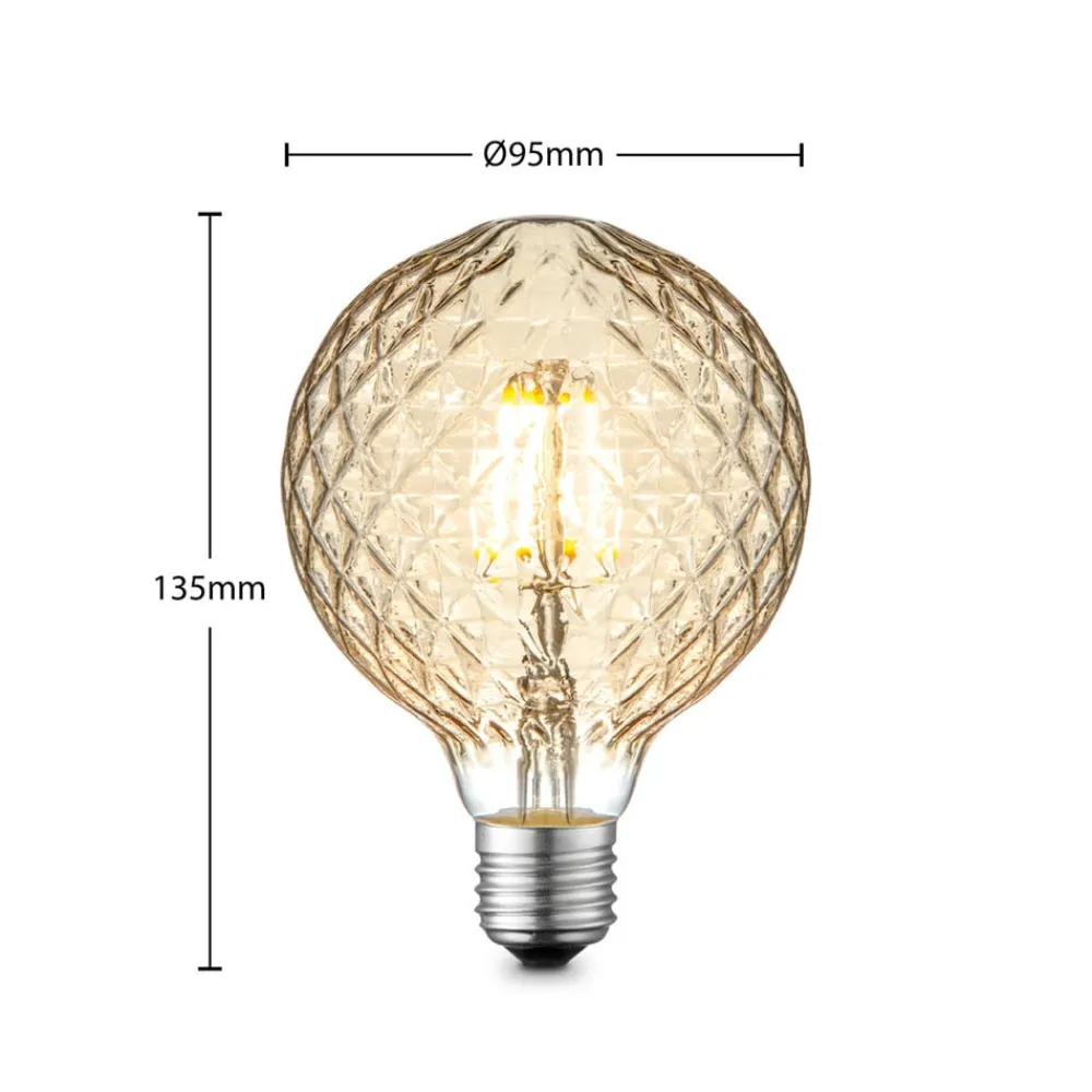 E27 G95 LED globe lampe 4W, varm hvid, dæmpbar via faseafbrydelse – dekorativ filament-look lampe med lamelformet overflade, glasskærm ravfarvet