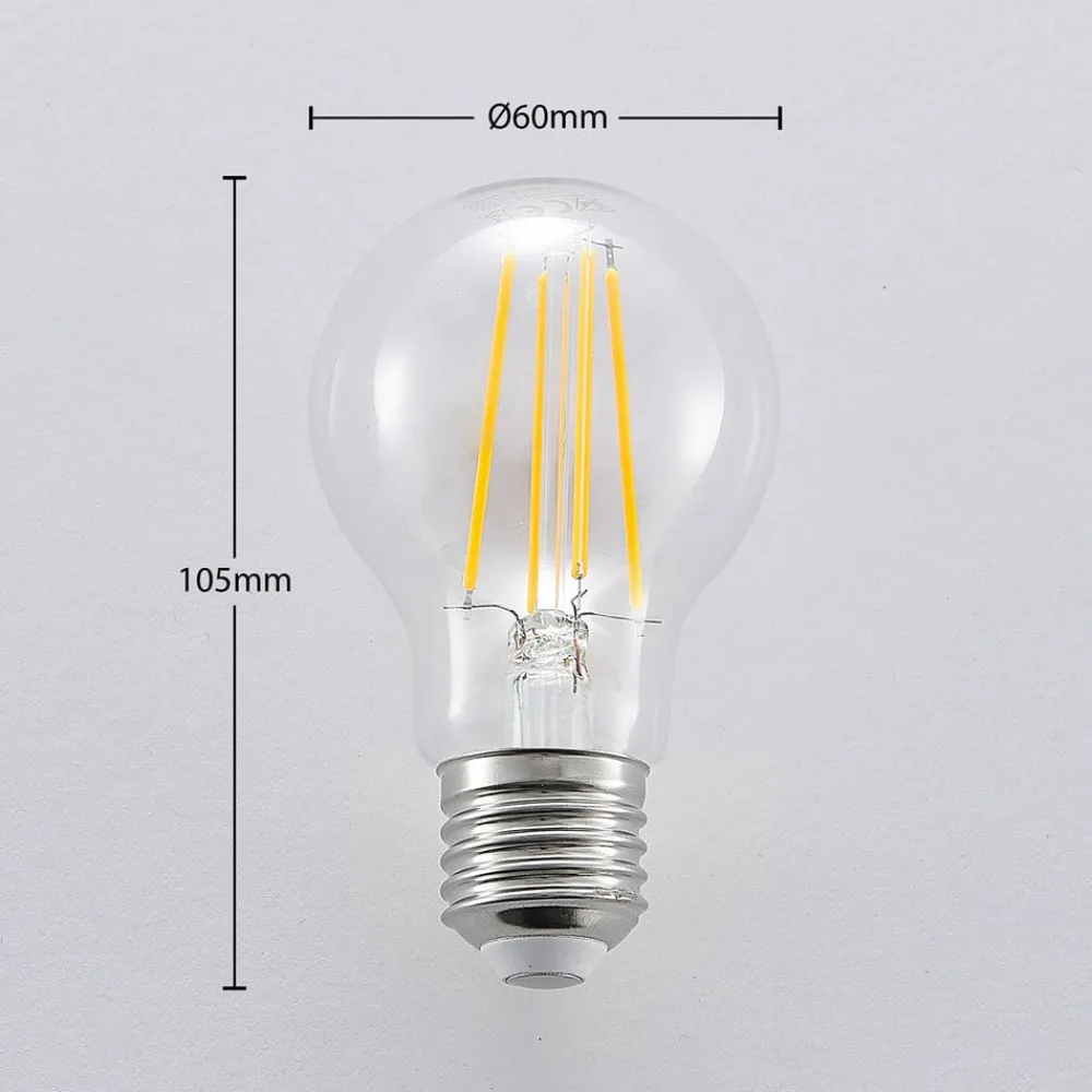 LED-lampe E27 filament klar, varmhvid, dæmpbar Denne klare LED-filamentpære er en dekorativ erstatning for traditionelle glødepærer på 60W i mange eksisterende armaturer. Lampens lysstyrke kan indstilles til tre niveauer (100%, 55%, 20%) ved hjælp af vægkontakten uden behov for en ekstra dæmper.