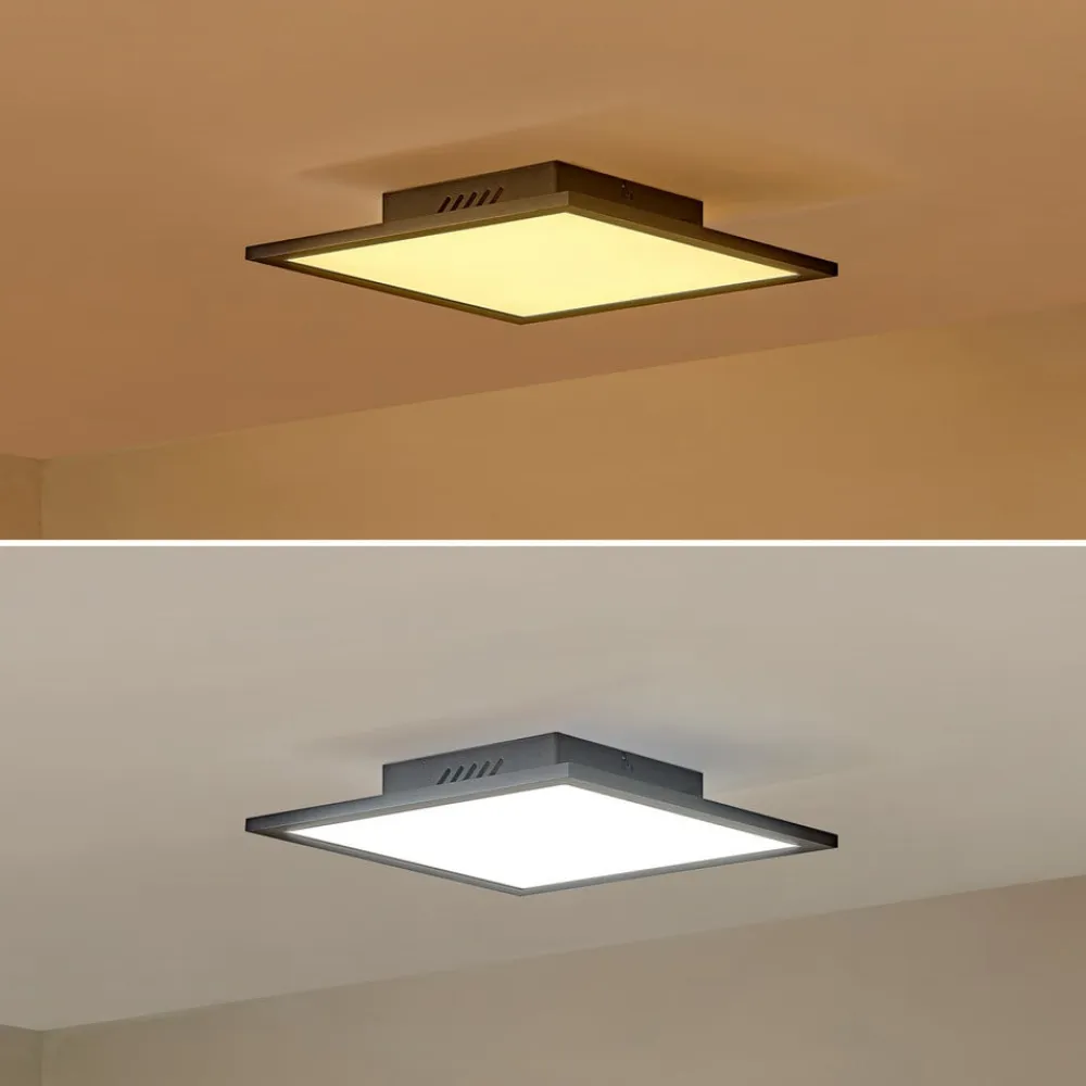 Lamin firkantet LED-loftlampe af aluminium og plast Lad dit interiør skinne med denne loftlampe. Farvetemperaturen på lyset fra loftlampen kan ændres, så det passer til dit humør. Takket være sit fremragende design supplerer loftlampen dit personlige indretningskoncept og er også en flot dekoration, når den er slukket. Takket være muligheden for at dæmpe lyset kan du også bruge en fjernbetjening til at skabe din egen personlige hyggebelysning. Lampen kan nemt tændes og slukkes med en fjernbetjening. Alle Lindby-mærkets kvaliteter og særlige egenskaber er samlet i denne lampe. Lampen er færdig i sort. Den vil sætte et flot præg på ethvert opholdsrum, uanset hvilken indretningsstil den kombineres med. Takket være sit enestående udseende harmonerer lampen med næsten alle omgivelser og skaber en god atmosfære. En hyggelig atmosfære er garanteret med denne lampe.