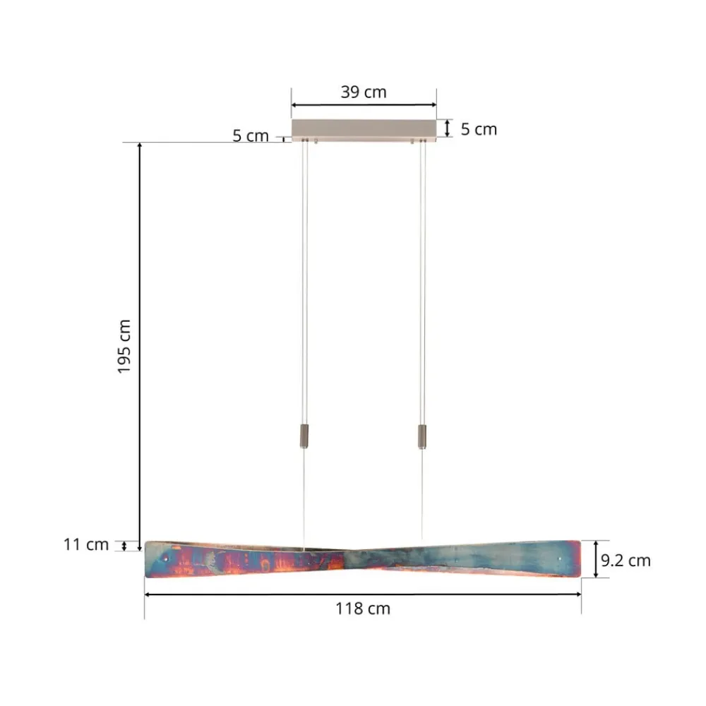 Højdejusterbar Lian barpendel med guldfarvet oxideret overflade og varmhvide, dæmpbare LED’er Lian er en eksklusiv lyskilde til spisepladsen, som skaber et meget trendy look takket være den kunstfærdige håndlavede oxidering af overfladen, som har en udpræget vintage-karakter og ligner en rusten overfladefinish. De to aluminiumsskærme er smukt buede og sidder overfor hinanden, så lyset fra LED-stangpendlen slipper ud opad og nedad og skaber et behageligt lys hele vejen rundt. Hvis der er installeret en ekstern forkant- eller bagkantfasedæmper, kan lysstyrken på de varmhvide LED’er justeres efter behov. Ophængets højde kan også justeres under drift, fra 105 cm til 195 cm, ved hjælp af integreret kabeltræksteknologi. Tilslutningspladsen i loftboksen er også meget stor, hvilket gør det nemt og bekvemt at installere lampen, som er designet til behagelig belysning i spiseområdet. LED-teknologien sikrer en meget god effektivitet, så der forbruges forholdsvis lidt strøm på trods af den høje lysstyrke. Lian er et LED-pendelarmatur af høj kvalitet, der er fremstillet i Tyskland efter de højeste kvalitetsstandarder, og som ikke kun giver et smukt lysbillede, men også er et stort blikfang takket være sit udseende. Farvegengivelsesindekset (CRI > 90) er usædvanligt højt, så farverne i lyset fra LED’erne vises så nøjagtigt som muligt.
