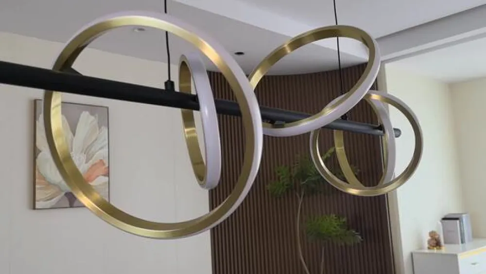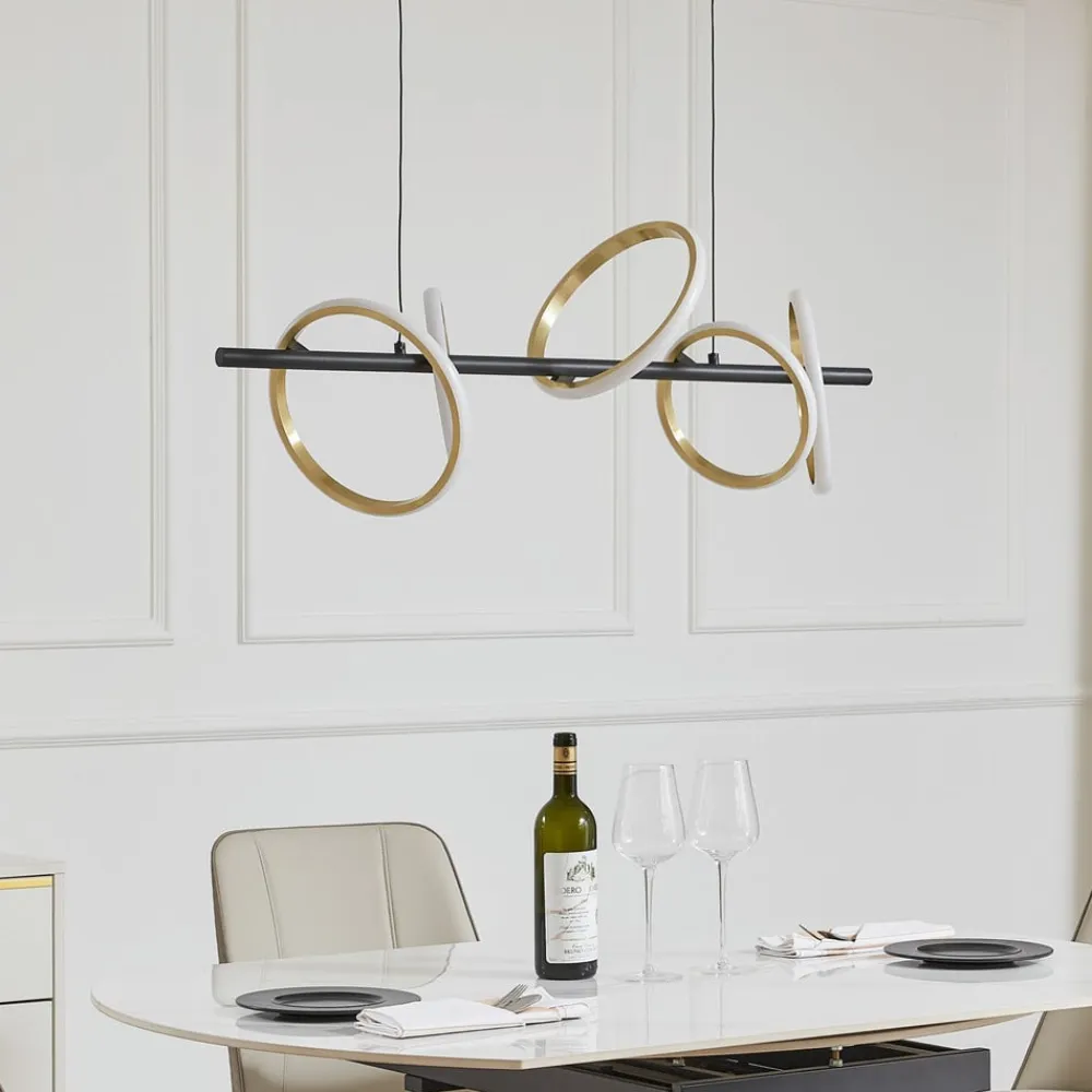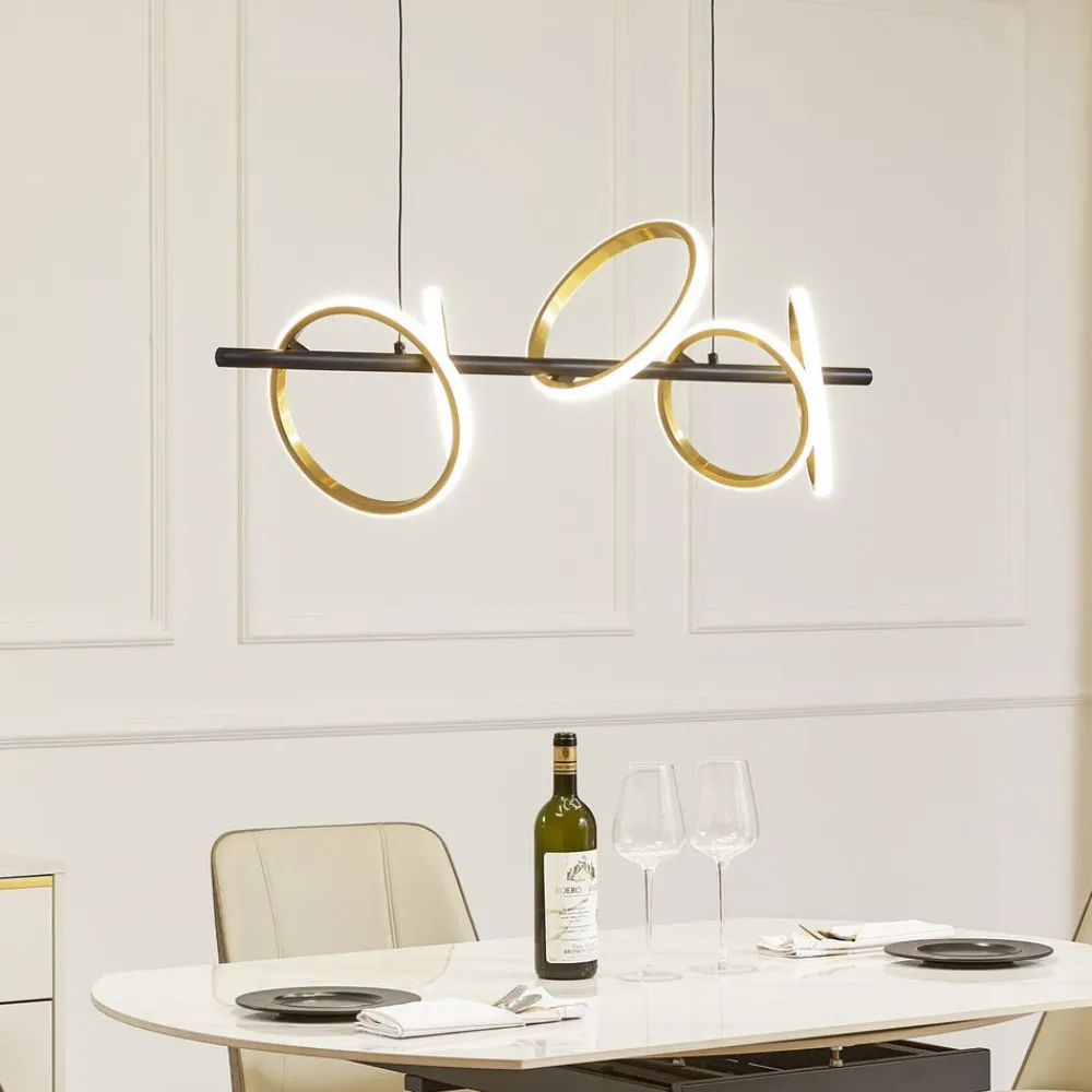 Madu LED-pendel med gyldne lyselementer Madu LED-pendel med ringformede lyselementer er en moderne og energibesparende belysningsløsning til hjemmet. På en sort stang er der monteret flere ringe, som imponerer med deres elegante, gyldne udseende. På ydersiden sidder LED’erne under en hvid afskærmning som en lysstribe og udsender et universelt hvidt lys hele vejen rundt. Lyskildernes forskellige placeringer giver pendlen et meget spændende og individuelt udtryk og er særligt attraktiv over et spisebord.