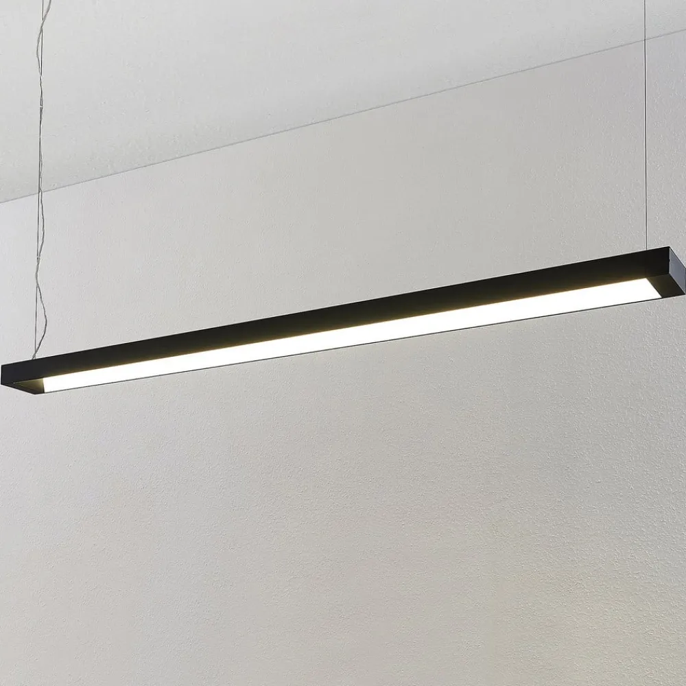 Langstrakt Cuna LED-pendellampe i sort Cuna passer godt i kontorlokaler og giver bred belysning, lysdiodernes strålevinkel er 120 grader. Lysdioderne udsender et universalhvidt lys, der giver mulighed for god koncentration i lang tid. Armaturhuset har en kantet form og en sort overfladefinish, hvilket gør pendellampen til et godt match til moderne interiør. Tekniske data: – 120° strålevinkel – IK03 slagfasthedsklasse – Universalhvid lysfarve – SDCM < 5 – Mulighed for gennemfortrådning