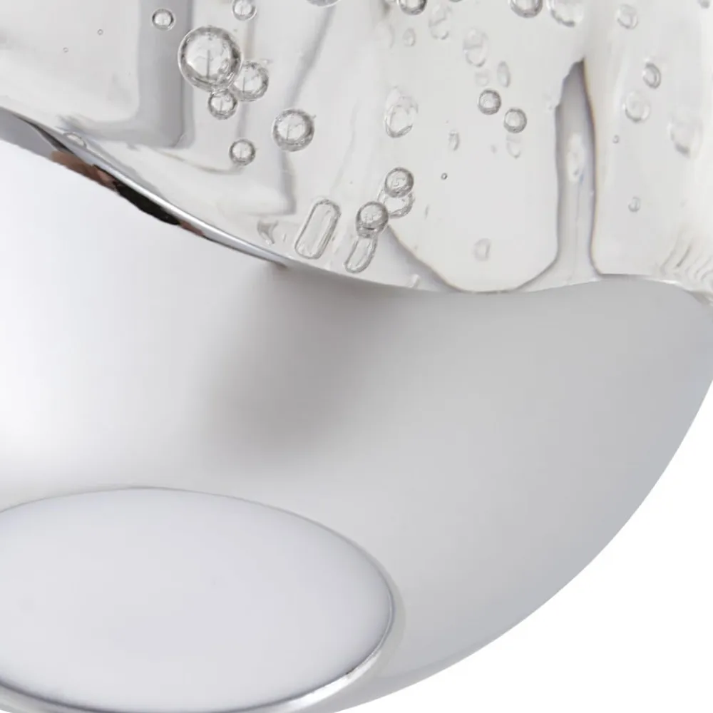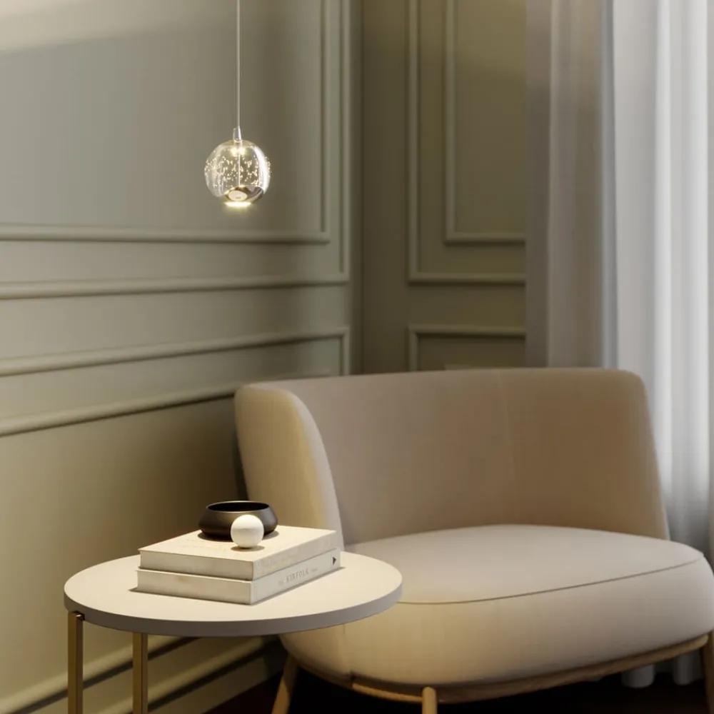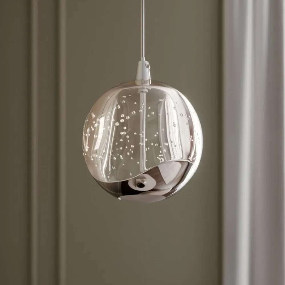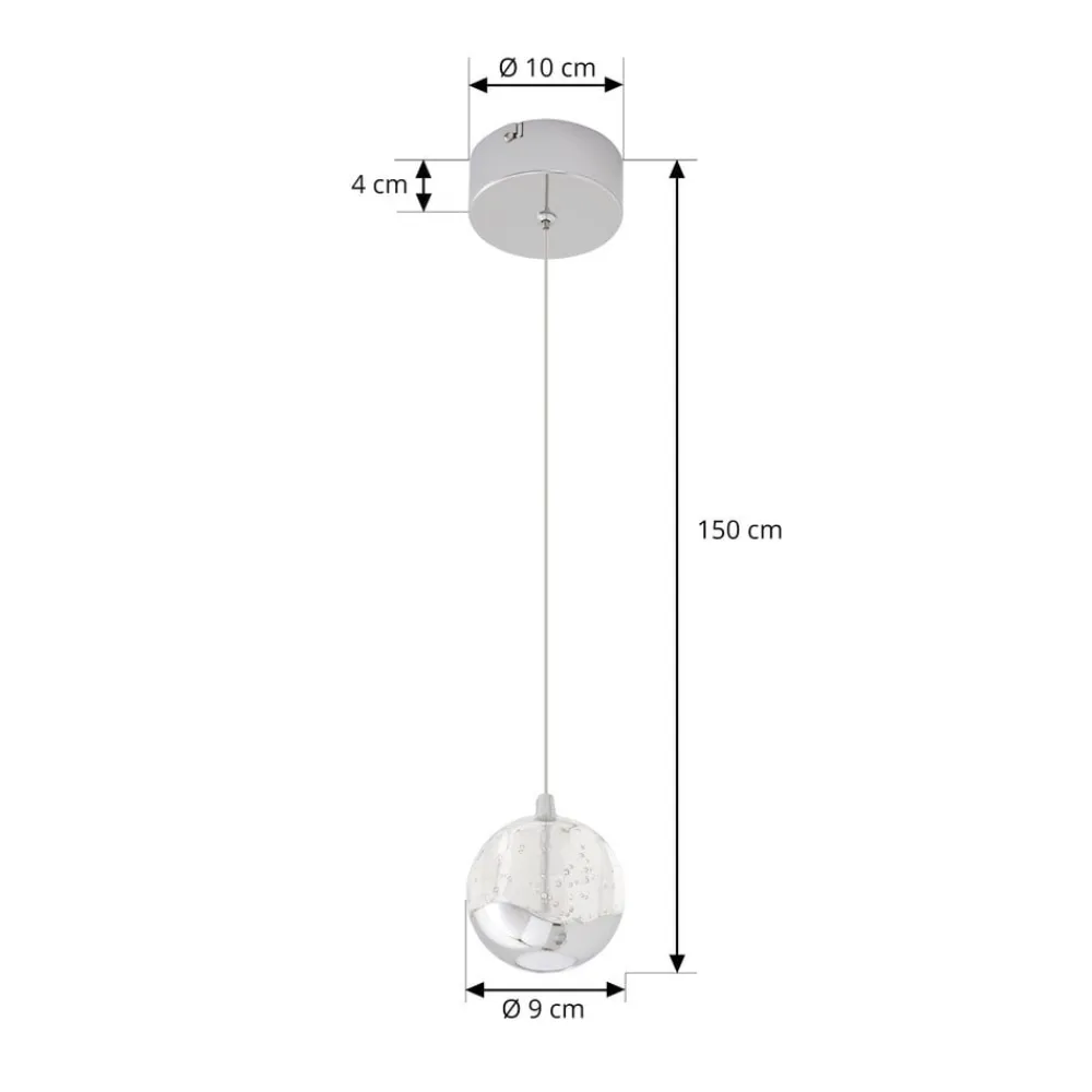 1 lyskilde LED-pendellampe Hayley med forkromede elementer og bobleglaskugle Hayley-pendellampen har utvivlsomt et meget moderne udseende og er en kompakt lyskilde til mange opholdsrum med moderne møblering. Skærmen er kugleformet og består hovedsageligt af glas med en attraktiv boblestruktur. Kun den nederste del suppleres af et metalelement, der ligesom loftbeslaget er lyst forkromet. Lyset udsendes både direkte og indirekte. Der er et hvidt dæksel, hvor lyset udsendes direkte, hvilket sikrer en blød lysfordeling med en meget hyggelig effekt. LED-pendellampens lysdioder er meget effektive og bruger meget lidt strøm på trods af deres tilstrækkelige lysstyrke.