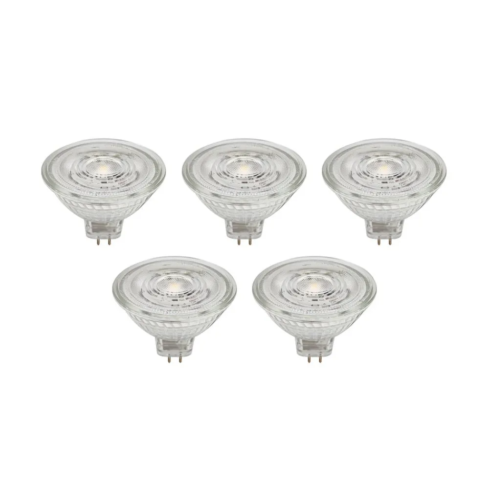 GU5.3 4,9W LED-reflektor af glas, transparent i praktisk sæt med 5 stk. Denne LED-reflektor passer til mange lamper med GU5.3-fatning. Den er lavet af glas og kan bruges fleksibelt takket være det gennemsigtige farvedesign – kan ikke dæmpes – 4,9 W – 500 lumen – udstrålingsvinkel 36° – leveres i et sæt med 5 stk