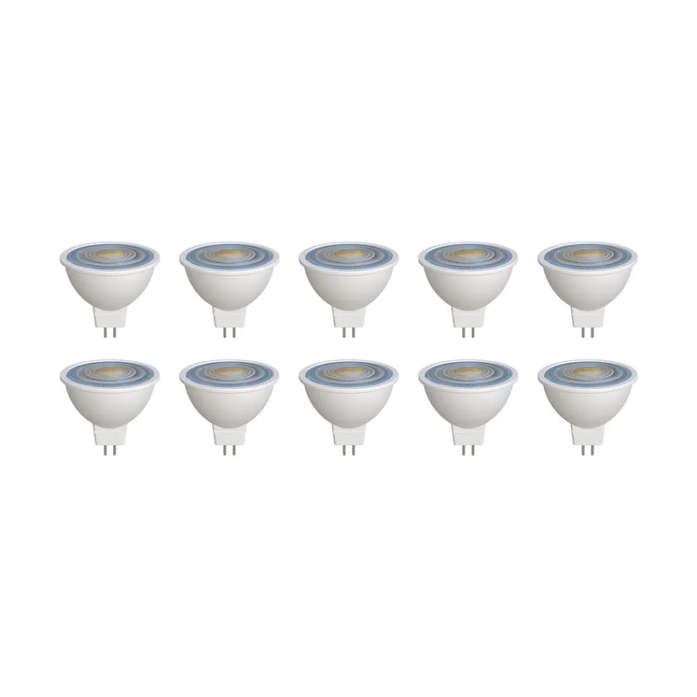 GU5.3 7,5W LED-reflektor af polykarbonat, hvid, i praktisk sæt med 10 stk. Denne LED-reflektor passer til mange lamper med GU5.3-fatning. Den er lavet af polykarbonat og kan bruges fleksibelt takket være sin hvide farve – kan ikke dæmpes – 7,5W – 621 lumen – udstrålingsvinkel 36° – leveres i et sæt med 10 stk