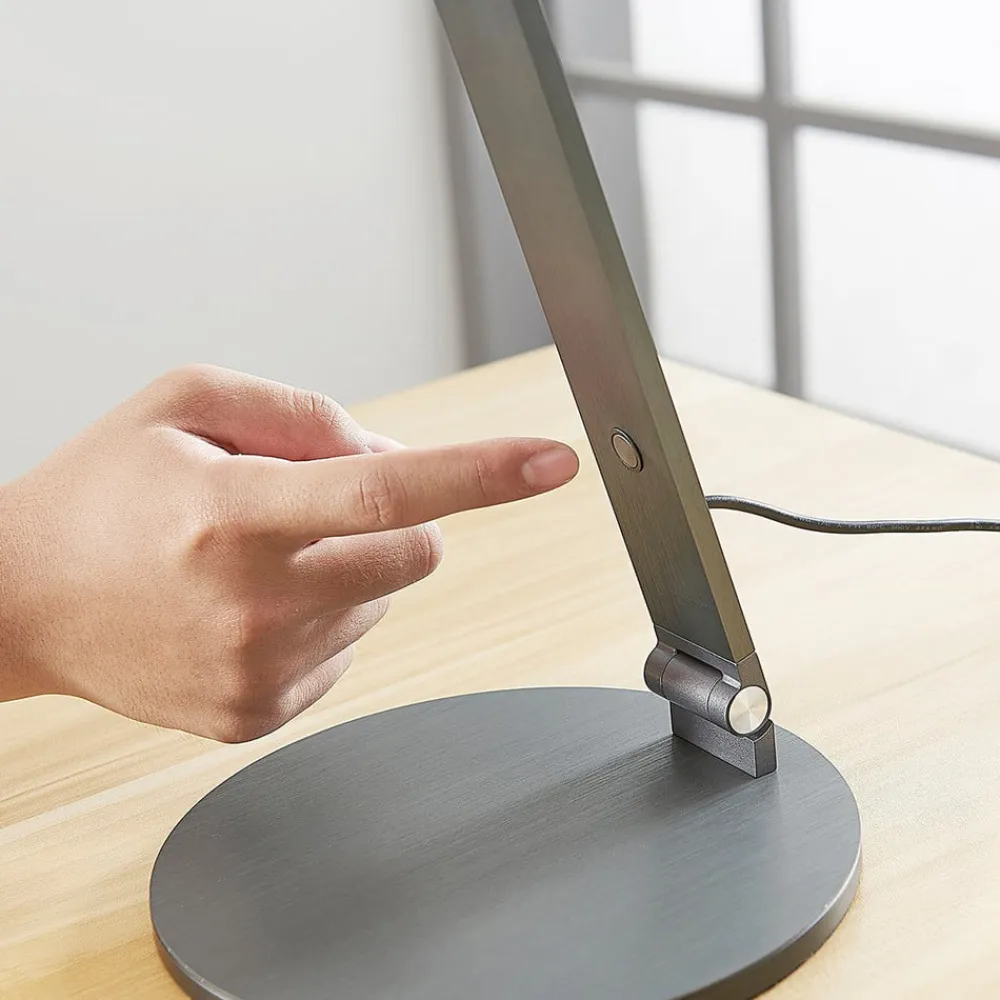 LED-skrivebordslampe Mion med rundt lampehoved og dæmper Mion er lavet af metal og har en blågrå overflade. Det flade, runde lampehoved er forbundet med den runde lampefod via tre led og to stænger, og dette design gør det muligt at justere lysstrålen optimalt. Berøringskontakten kan også bruges til at justere lysstyrken i fire trin (100%/50%/10%/off). Dette gør Mion bordlampen til en meget nyttig lyskilde til skrivebordet.