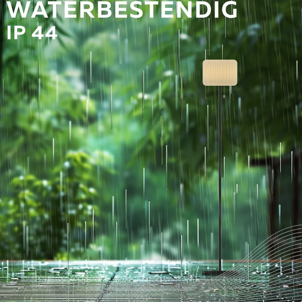 Moderne LED-gulvlampe til udendørs brug – udstyret med genopladeligt batteri, solcellemodul og RGB-funktion Denne gulvlampe med hvid plastcylinderskærm og metalramme er en imponerende ekstra kilde til stemningsfuldt lys på terrasser, balkoner og til havefester. Det genopladelige batteri muliggør mobil brug. Den kan oplades enten via kabel eller helt selvstændigt ved hjælp af sollys. Med trækkontakten på parasollen kan du tænde og slukke lyset og vælge lysfarve (varm hvid eller farverige nuancer) – Beskyttelsesklasse: IP44 – Udstyret med 2600 mAh batteri – Udstyret med solcellemodul – Inkluderer 2 m ladekabel (til opladning i tørre indendørs områder)
