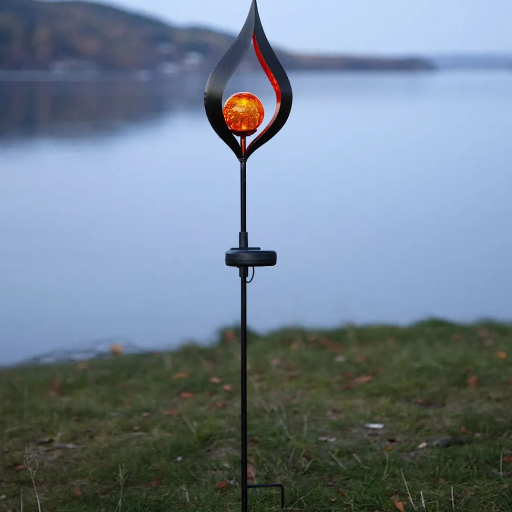LED-solcellelampen Melilla minder med sin spids om flammen på et stearinlys. Den kugleformede lampeskærm med orange farve danner spidsens centrum og skjuler en LED i sig, der fås til at lyse med jordspyddet. Takket være solcellemodulet og et genopladeligt batteri kræves der ikke nogen ekstern strømkilde. Med fuldt opladet batteri kan dekorationslampen lyse i op til otte timer. Om dagen slukker lyssensoren lampen, og solcellemodulet kan så igen oplade batteriet.