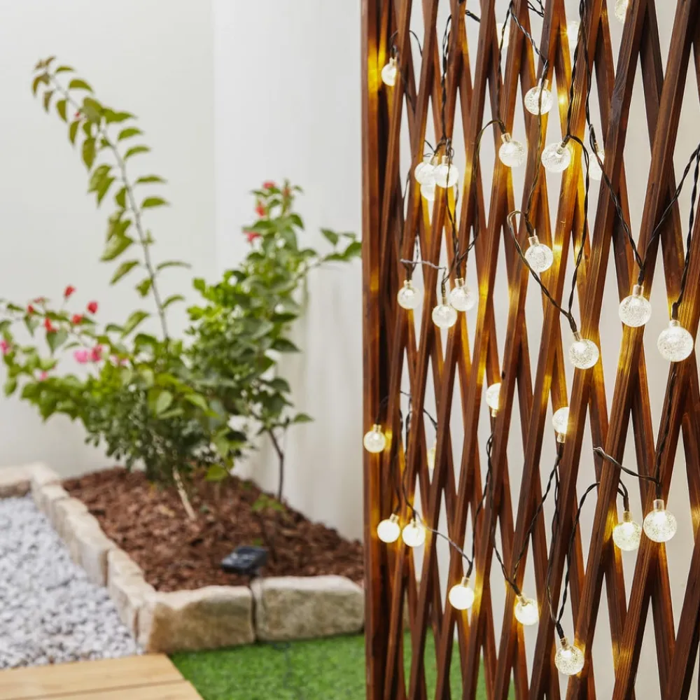 30-lys LED-sollyskæde Mionel med lyskugler Mionel er en LED-lyskæde, der drives af et solpanel. Det gør den perfekt til udendørs brug. De 30 lyskilder har en sfærisk form og fastmonterede LED’er. Takket være solcelledriften kan den placeres og flyttes fleksibelt. Den giver en attraktiv accentbelysning i de sene aftentimer og hjælper med at afslutte aftenen – inkl. 2V 200mA solpanel – med otte justerbare lystilstande