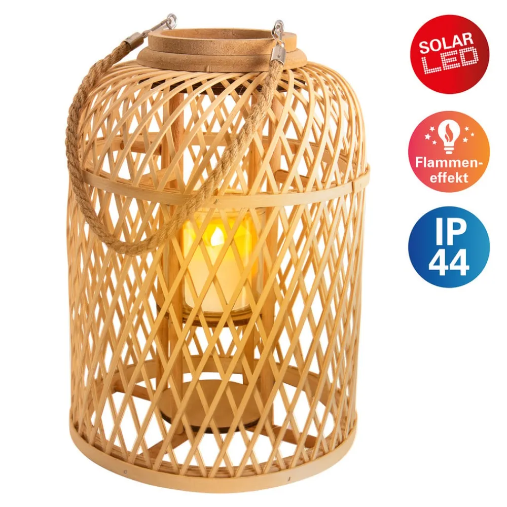 Dekorativ LED-solcellelanterne Bambuskurv med LED-lys Denne smukke solcellelanterne kan bruges overalt udendørs til dekoration og stemningsfuld ekstra belysning. Den kan stilles op eller, da den er udstyret med en jutesnor, hænges op på f.eks. en gren. Kroppen er lavet af kurvlignende vævet bambus, og i midten er der et hvidt lys med en LED-lyskilde, som udsender et særligt varmt hvidt lys. LED-lyset flimrer også, hvilket giver en meget autentisk effekt. Med et fuldt opladet batteri holder lyset i ca. seks til otte timer.