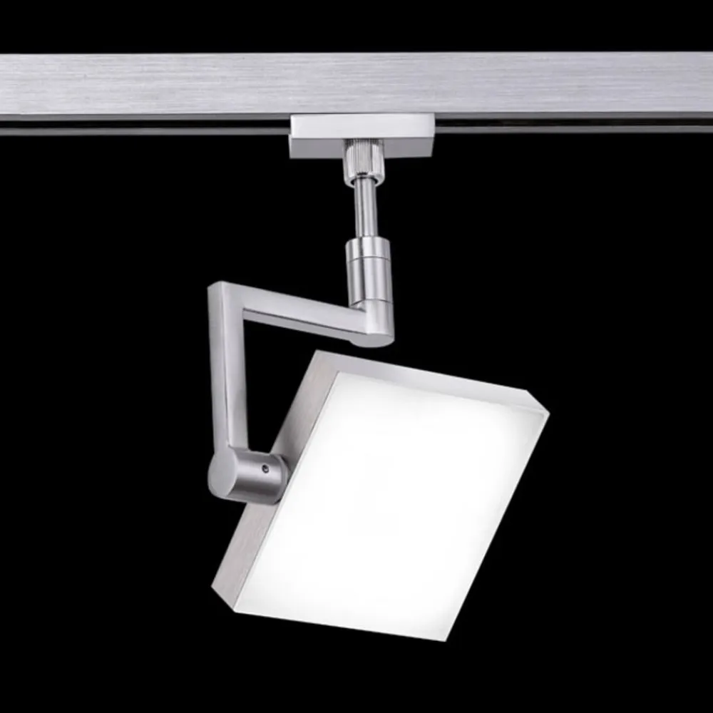 Firkantet LED-spotlight 70013 til Track 4 LED-skinnesystem Dette firkantede LED-spotlight kan drejes i sin holder, så det sender lys direkte eller indirekte ud i rummet. Det særlige ved spotlightet er, at det kan dæmmes i tre trin ved hjælp af den enkle lyskontakt.