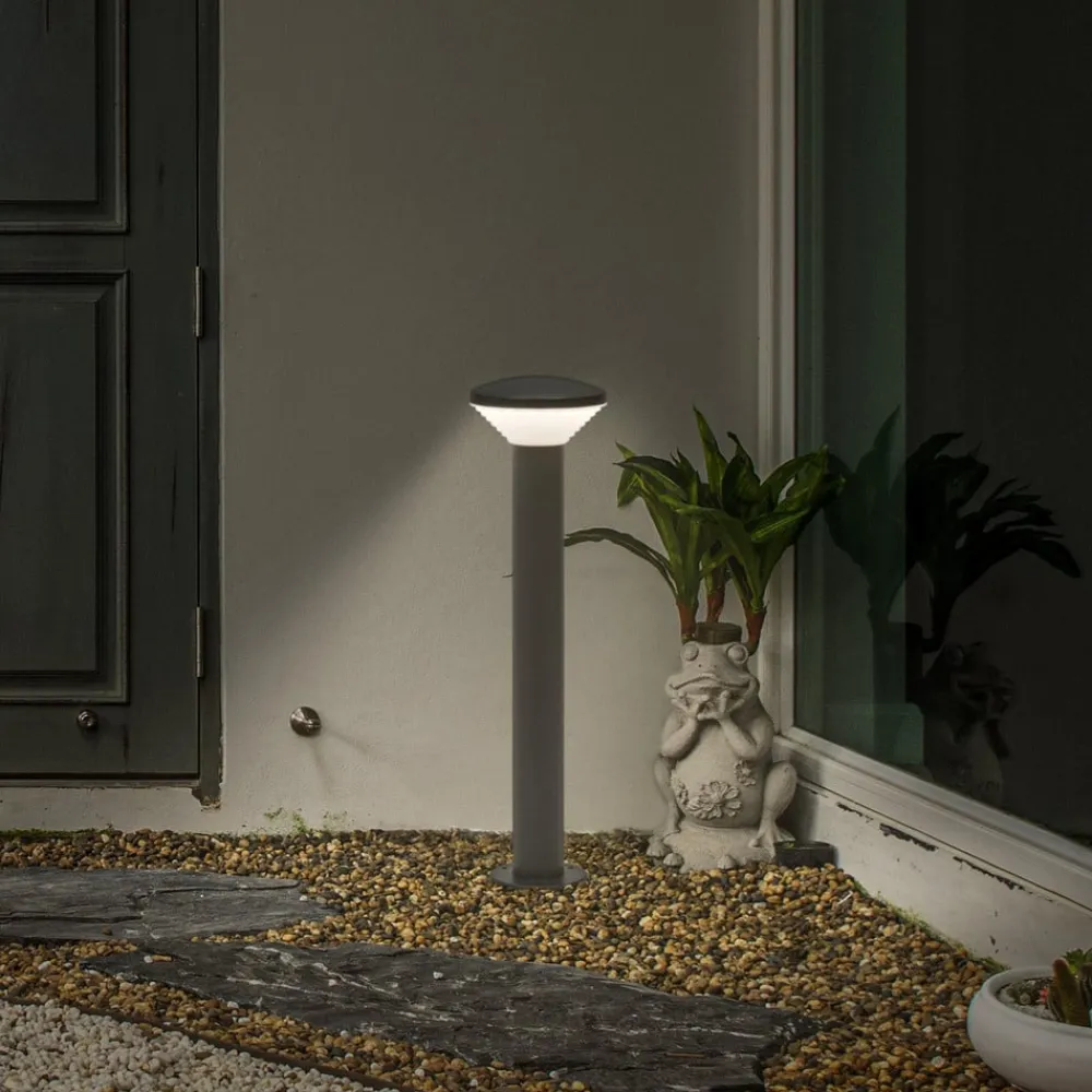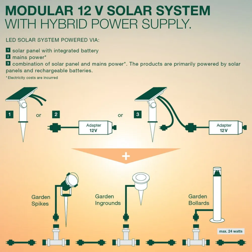 Endura Hybrid Olona LED stibelysning i rustfrit stål, mørkegrå Olona LED stibelysning fra Endura Hybrid-serien er en lyskilde til udendørs brug, som kan betjenes på forskellige måder med det passende tilbehør. Den kan både bruge solenergi og strøm fra elnettet. Skærmen på armaturet i rustfrit stål er lukket i toppen og udstyret med en konisk polykarbonatdiffusor i bunden, så lyset skinner nedad. Olona stibelysning kan betjenes på forskellige måder: Tilsluttet lysnettet via transformeren giver den kontinuerlig belysning, mens den tilsluttet solpanelet lyser gratis. Begge forsyningsvarianter er også mulige sammen, i hvilket tilfælde lyset automatisk skifter til netstrøm, så snart solpanelets batteri er tomt. Vigtigt: Solpanel, transformer og stiksæt skal bestilles separat som tilbehør – Enkel, værktøjsfri installation uden specialistviden takket være stikforbindelser – Maksimal tilsluttet belastning pr. solpanel = 24W – Beskyttelsesklasse for stikket: IP67 – Beskyttelsesklasse for lyset: IP44 – 12 V DC-spænding for maksimal sikkerhed for mennesker og dyr – bæredygtig belysning til udendørsarealer, terrasser, altaner osv.