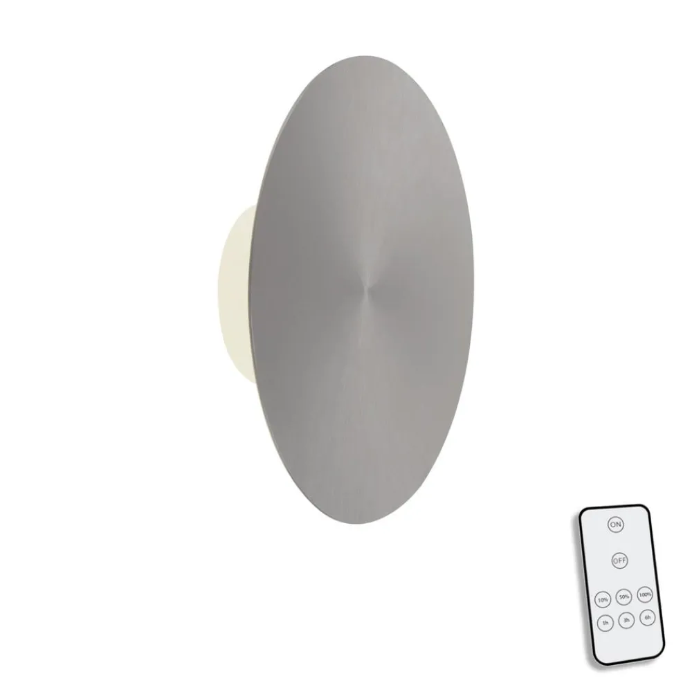 Rund LED-væglampe Akku Puntua med et moderne look LED-væglampen Akku Puntua er det perfekte valg for alle, der er på udkig efter en moderne og stilfuld væglampe, som indhyller hjemmet i en varm og hyggelig atmosfære! Det elegante armatur er fremstillet af aluminium i høj kvalitet og imponerer med sit runde, tidløse design. Det særlige ved Akku Puntua er, at den takket være batteridriften er ideel til brug på steder, hvor der ikke er strøm i nærheden. Lysfarven er en behagelig varm hvid, som skaber en hyggelig atmosfære. Takket være den praktiske fjernbetjening kan lyset dæmpes, og lysstyrken kan justeres efter individuelle behov. Hukommelsesfunktionen sikrer, at den valgte indstilling gemmes, efter at lyset er slukket. Inkluderer IR-fjernbetjening – Let at skille ad for at genoplade – Med timer: 1, 3 eller 6 timer – Lysvarighed: 7-40 timer