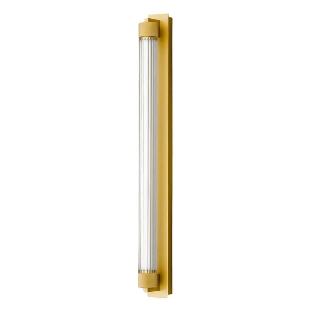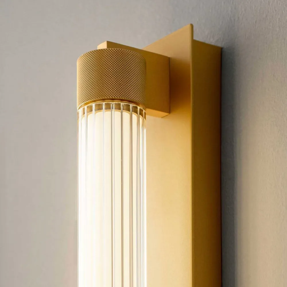Den rektangulære vægbeslag er fremstillet af jern og aluminium og har en cylindrisk diffusor, der er omgivet af riflede hovedstykker. Borosilikatglasset har et fint, lige rillemønster.