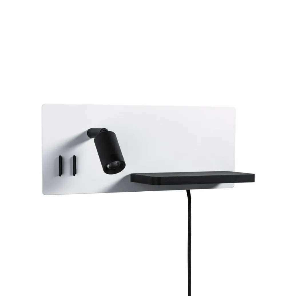 Serra LED-læselampe med USB-port og hylde Serra LED-væglæselampen til montering på siden af sengen i et moderne sort-hvidt design kombinerer æstetik og funktionalitet for at skabe en behagelig atmosfære. Med sit USB Type-C-opladningsstik på siden til hurtig opladning og den praktiske opbevaringsflade til mobiltelefoner giver den også merværdi ved at gøre det muligt at oplade smartphones eller tablets direkte på lampen. Det drejelige lampehoved, som ligner et lille spotlight, giver fleksibel belysning, der er ideel til læsning. Armaturet har også en baggrundsbelysning, der kan dæmpes i tre trin for at give et diskret omgivelseslys på væggen. Den vægmonterede læselampe Serra er ideel til at placere ved siden af sengen og fås i en version til højre og venstre. En tænd/sluk-kontakt på lampen gør den nem at betjene på stedet – Klar til at blive tilsluttet med tekstilkabel af høj kvalitet (aftageligt, så den kan tilsluttes direkte)