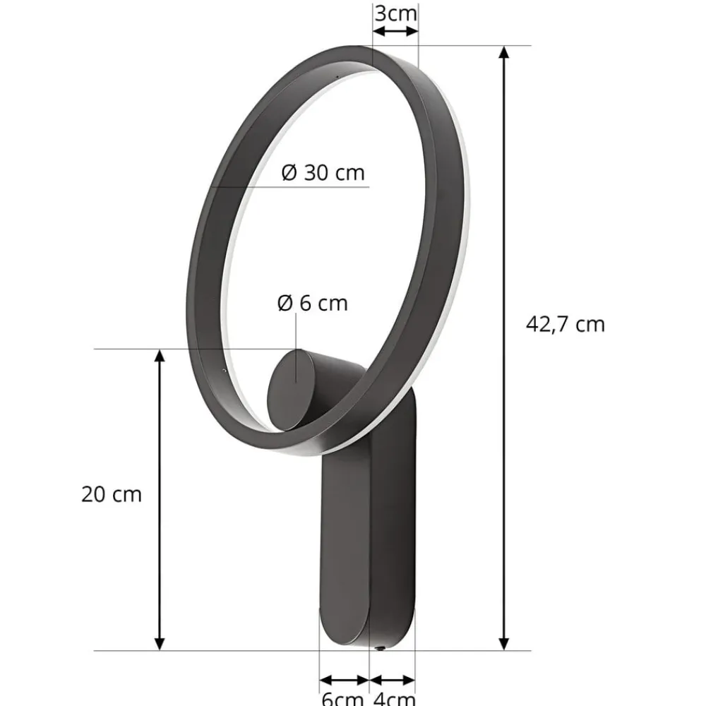 - Ring – Ø 30 cm, dybde 3 cm; vægbeslag – bredde 6 cm, højde 19,5 cm, dybde 4 cm