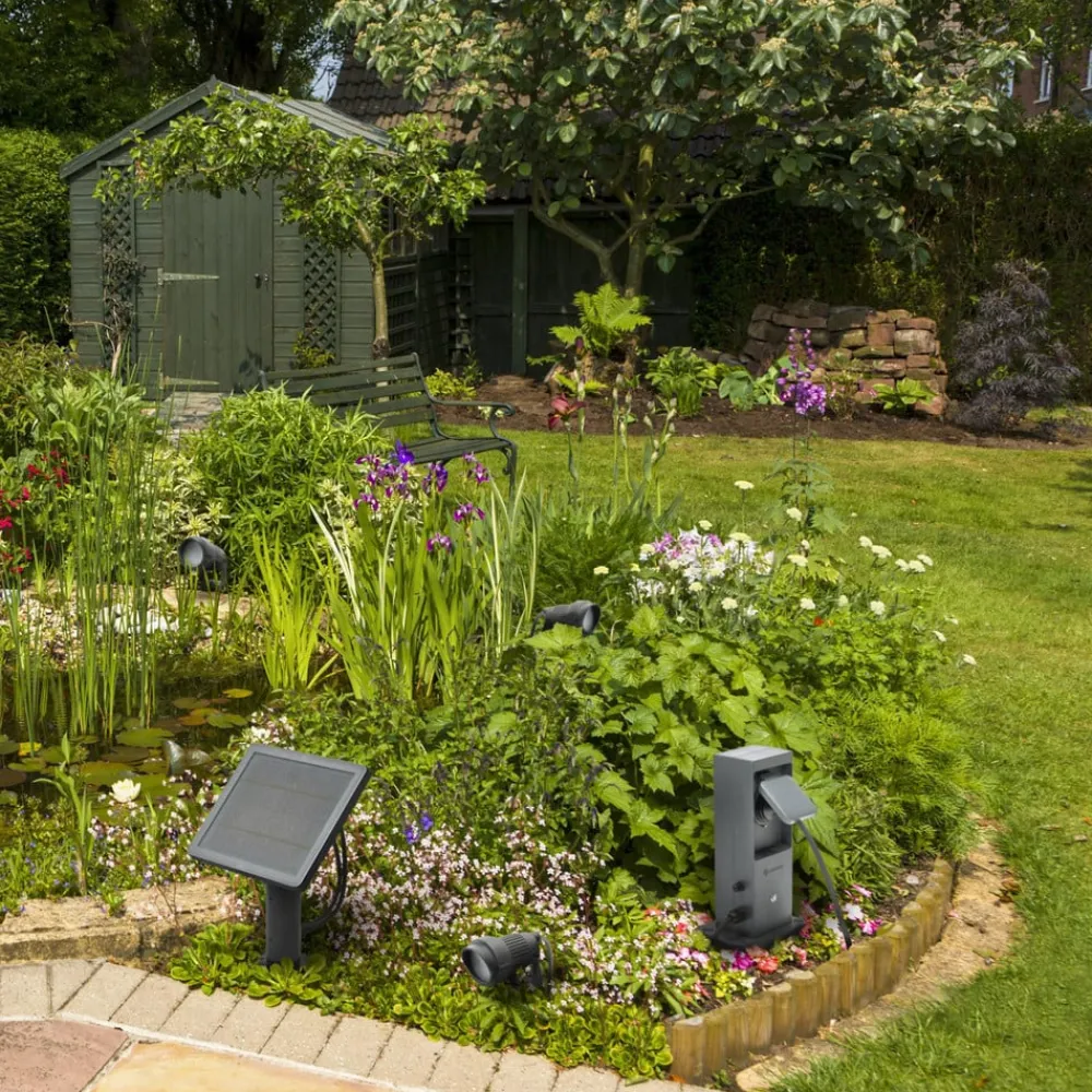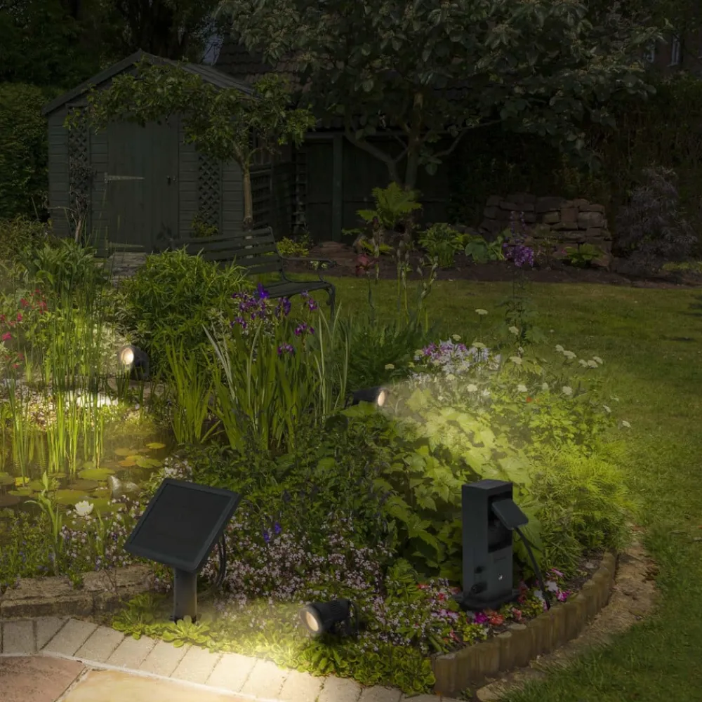 LED jordspydslys Endura Hybrid Naut Spike 1 W Endura Hybrid Naut Spike er et LED jordspydslys med et spotlys, der kan justeres i beslaget og betjenes på forskellige måder. Spottet kan bruges til at skabe målrettede, varmhvide lysaccenter i hele udendørsområdet. Spottet kan drives enten med energi fra lysnettet eller uafhængigt af solenergi, og en kombination af begge driftsformer er også mulig, så der er garanti for permanent belysning, selv når solen ikke skinner. Til drift med energi fra stikkontakten skal der bruges en transformer til tilslutning til lysnettet, mens der til drift med solenergi skal bruges et solpanel og et tilslutningssæt. Kombinationen af begge sikrer permanent belysning, da lampen automatisk skifter til lysnettet, så snart solpanelets batteri er tomt. Vigtigt: Solpanel, transformer og tilslutningssæt skal bestilles separat som tilbehør – Enkel, værktøjsfri installation uden specialviden takket være stikforbindelser – Maksimal tilsluttet belastning pr. solpanel = 24W – Beskyttelsesklasse for stikkene: IP67 – Beskyttelsesklasse for lampen: IP44 – 12 V DC-spænding for maksimal sikkerhed for mennesker og dyr – bæredygtig belysning til udendørsarealer, terrasser, altaner osv.