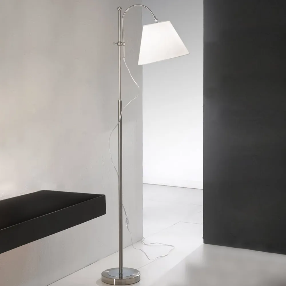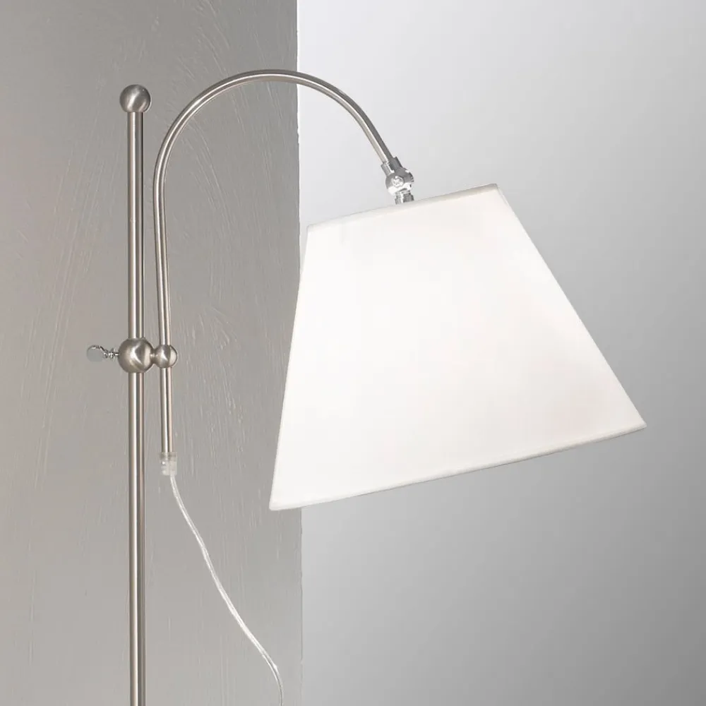 Lilly – en klassisk standerlampe med en hvid skærm i stof og en buet arm